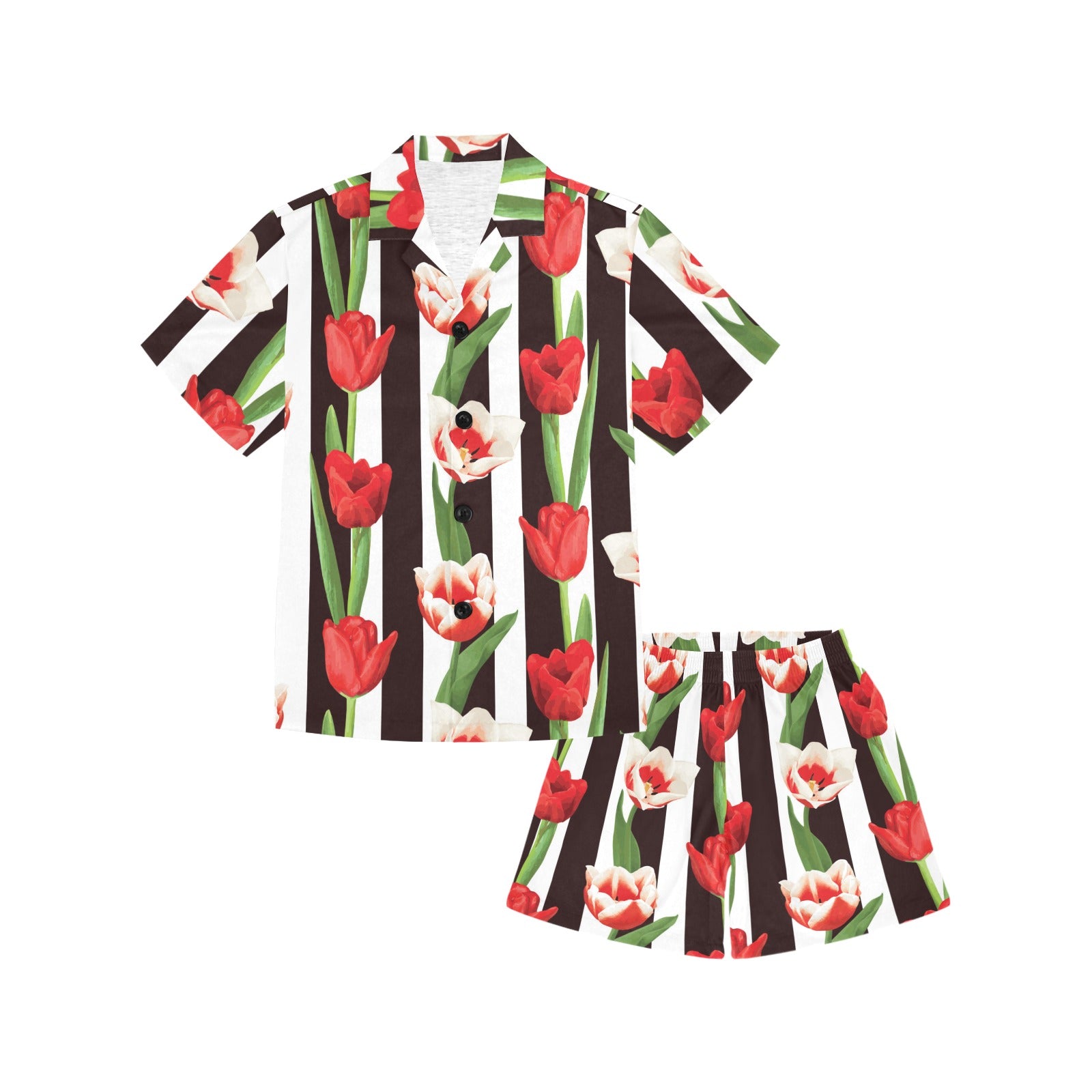 red and white tulips pattern Kids' Boys' Girls' V-Neck Short Pajama Set