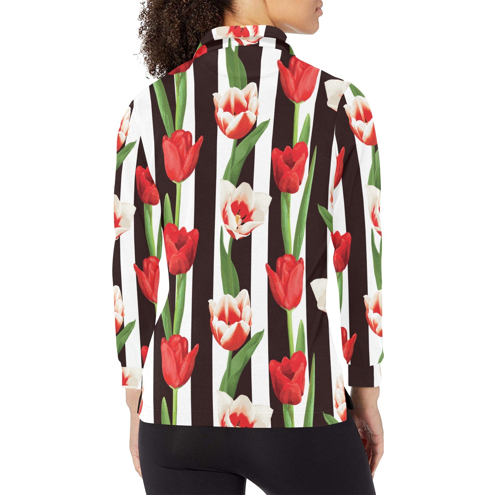 red and white tulips pattern Women's Long Sleeve Polo Shirt