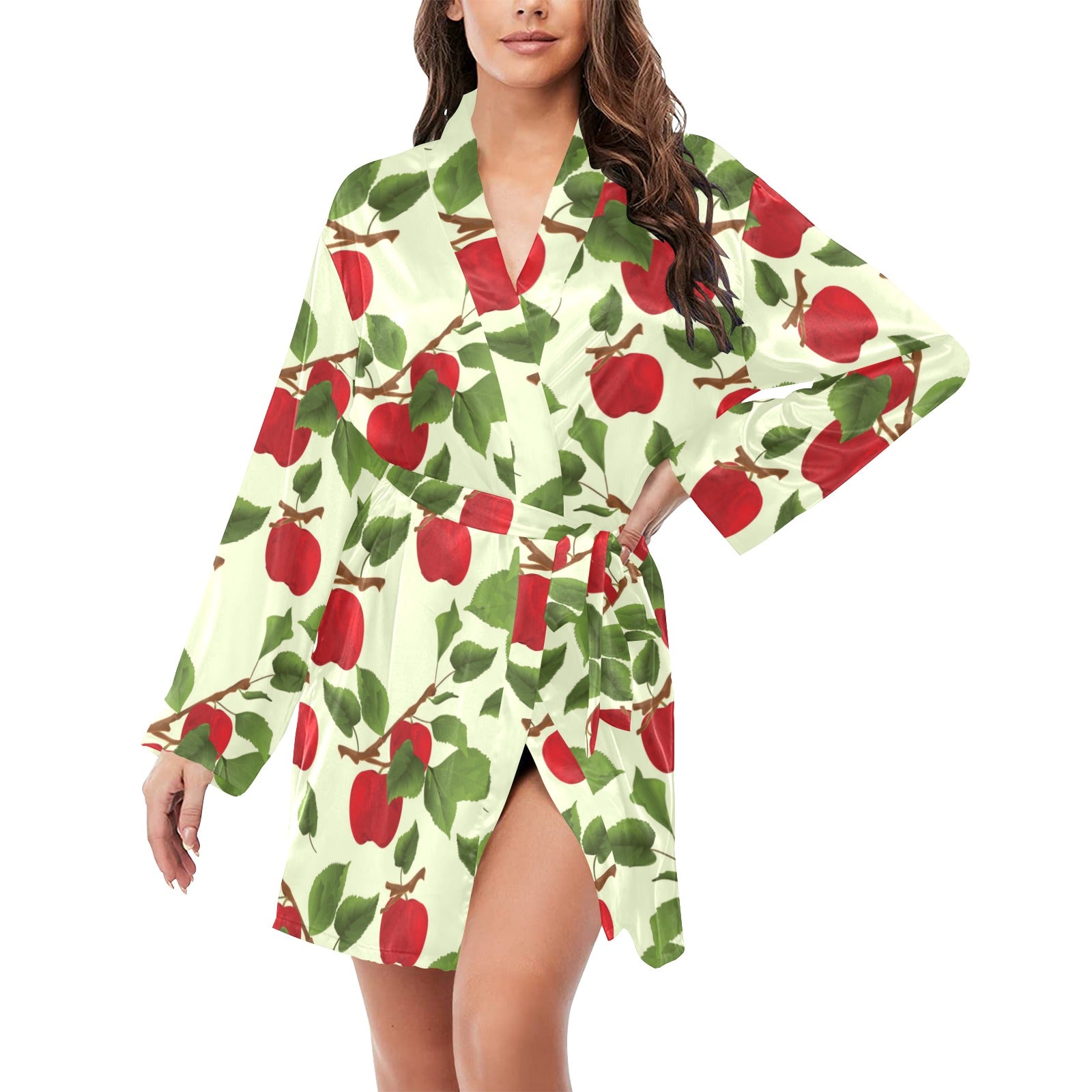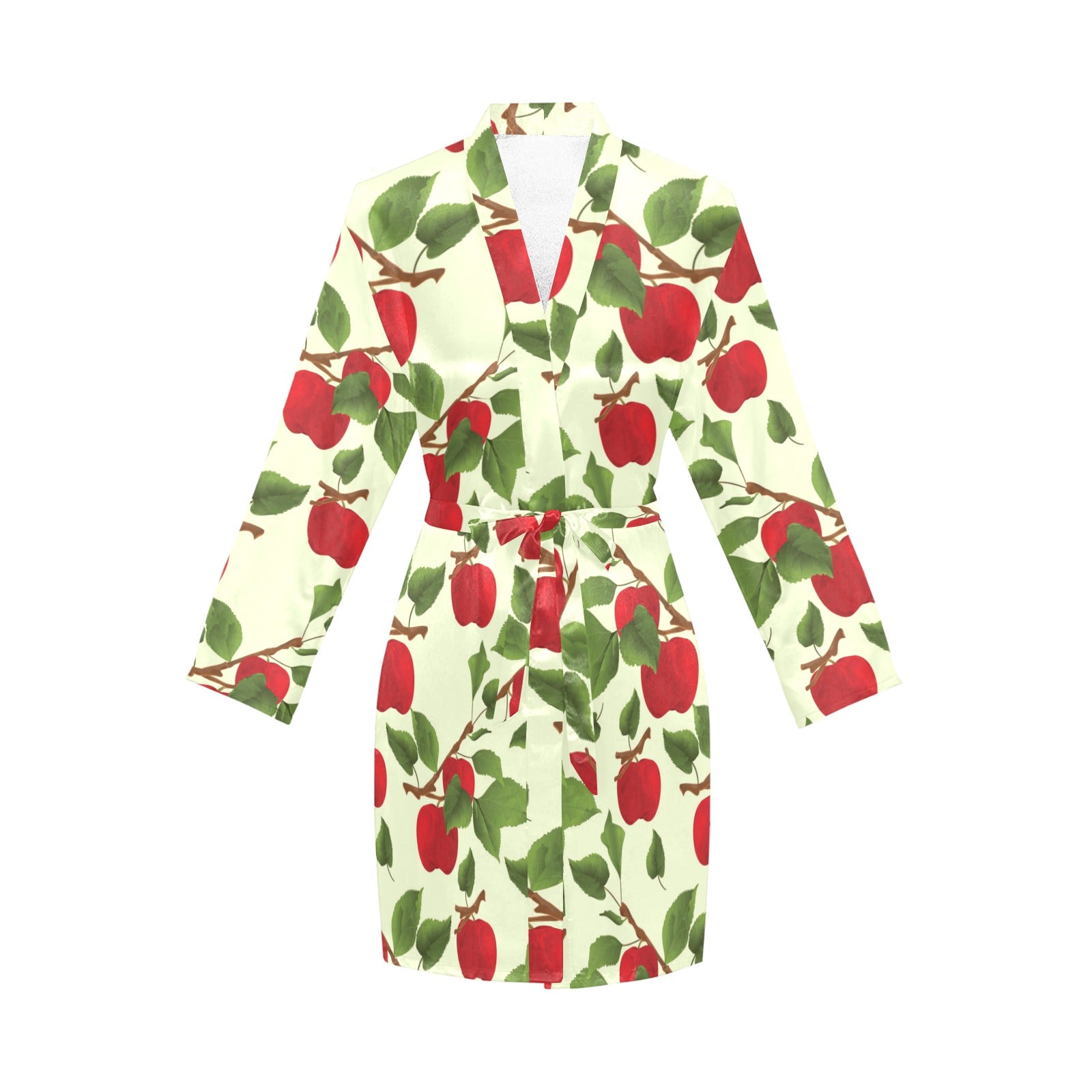 Red apples leaves pattern Women's Long Sleeve Belted Night Robe