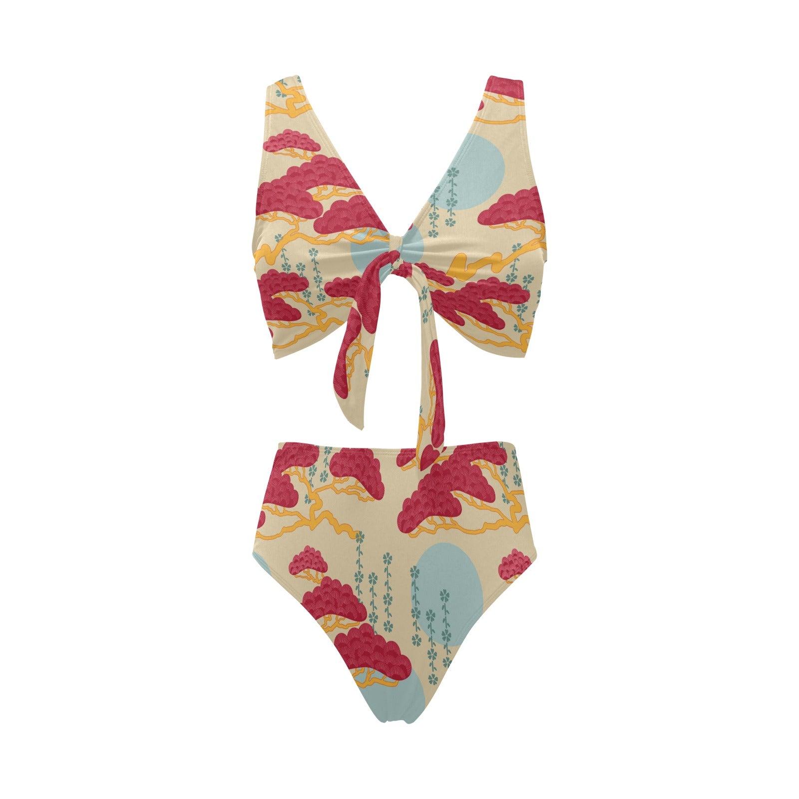 Red Bonsai gray sun japanese pattern Chest Bowknot High Waisted Bikini Swimsuit
