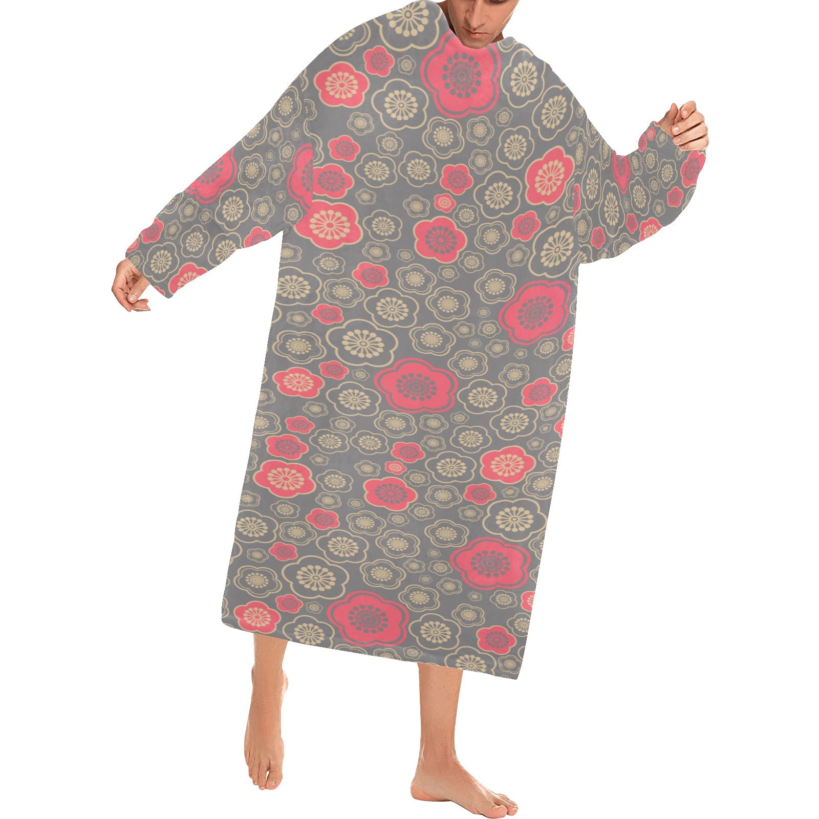 Red gold Sakura cherry blossom gray background Blanket Robe with Sleeves