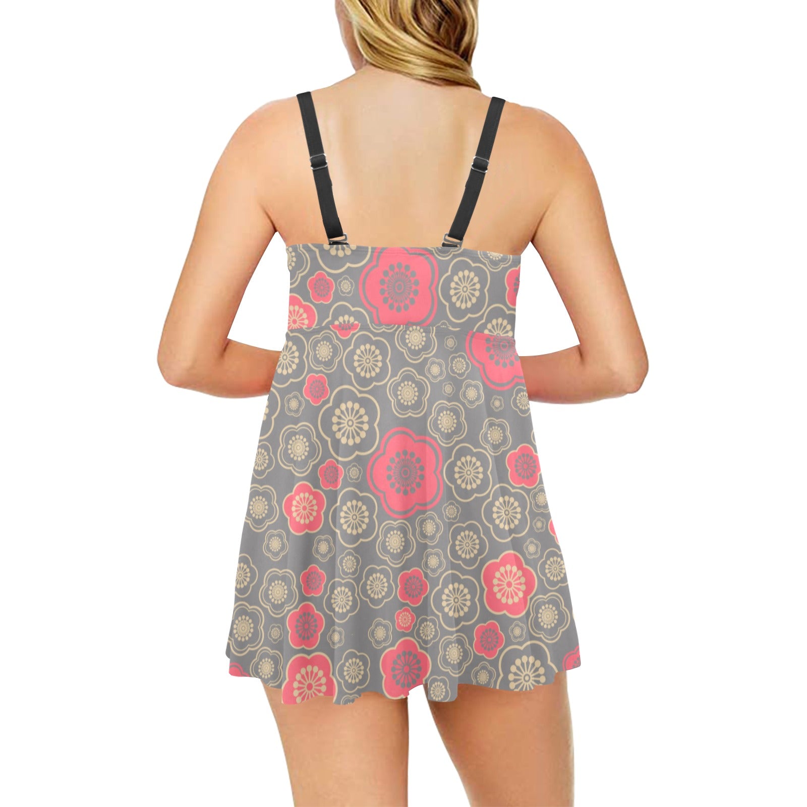 Red gold Sakura cherry blossom gray background Chest Sexy Pleated Two Piece Swim Dress