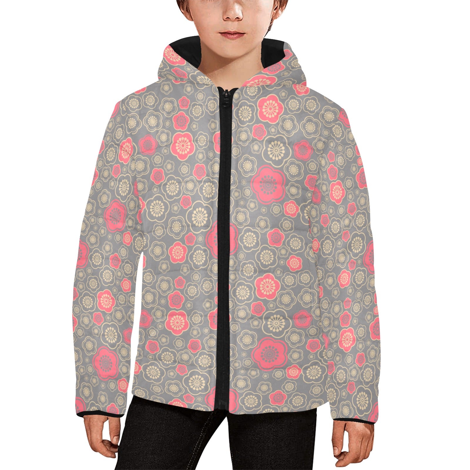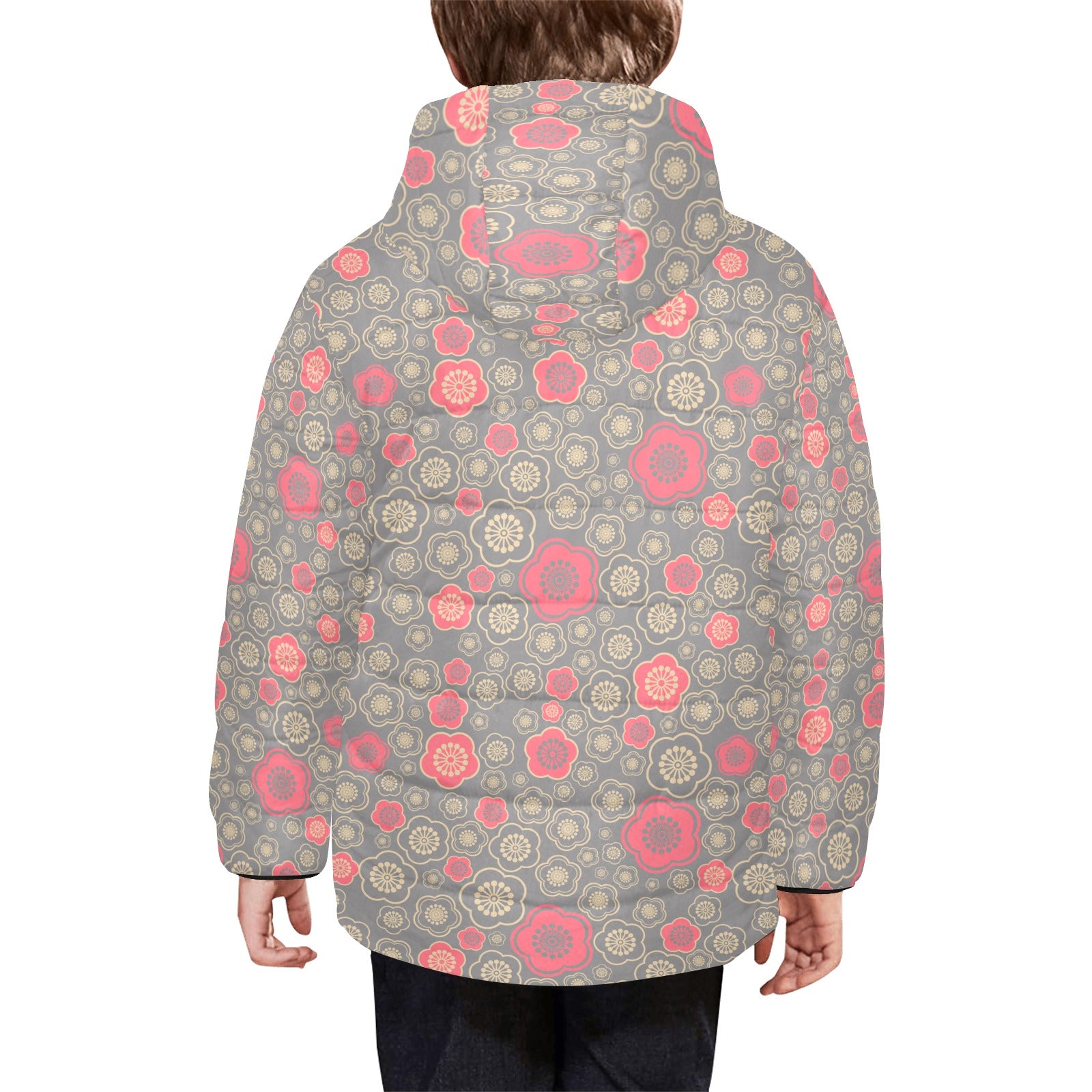 Red gold Sakura cherry blossom gray background Kids' Boys' Girls' Padded Hooded Jacket