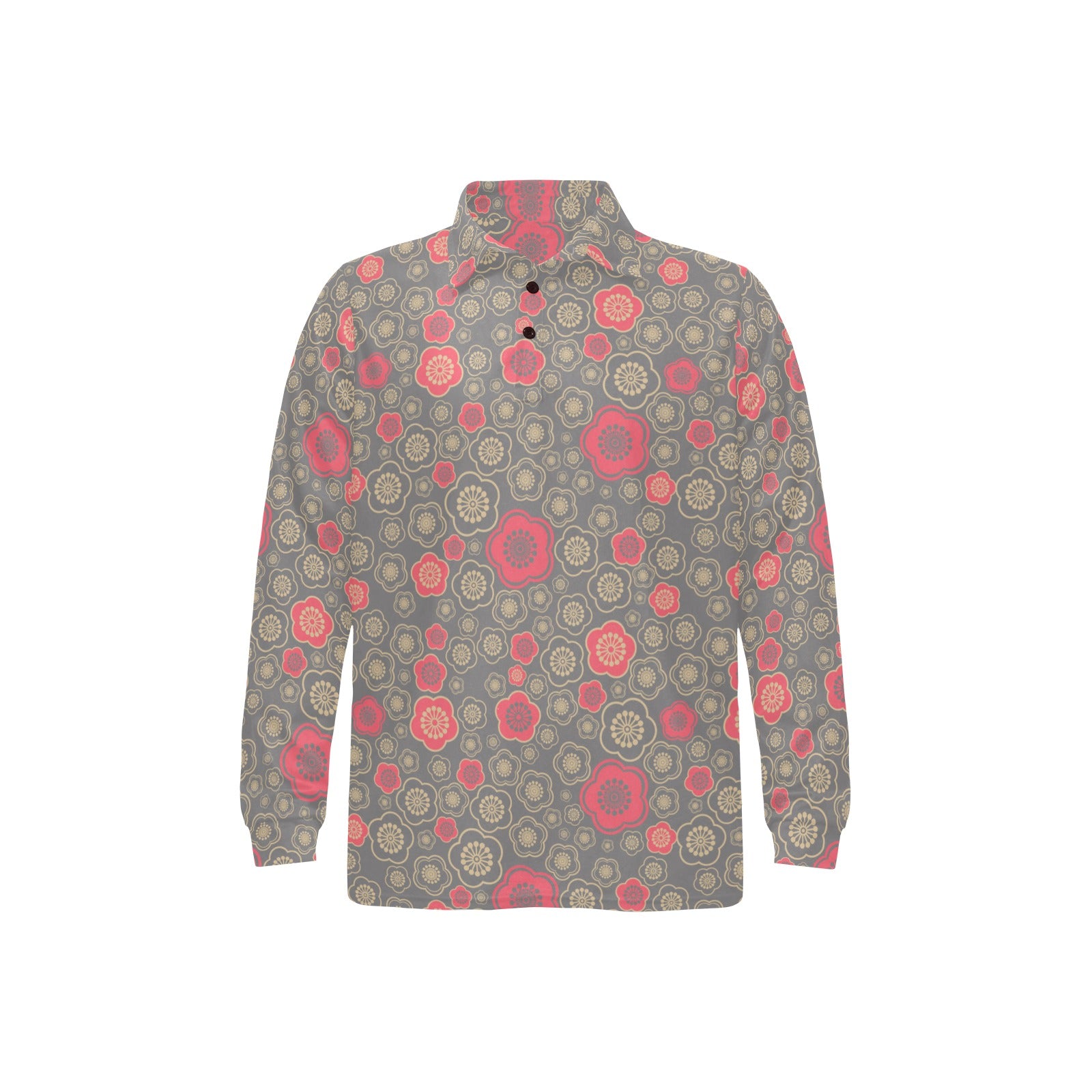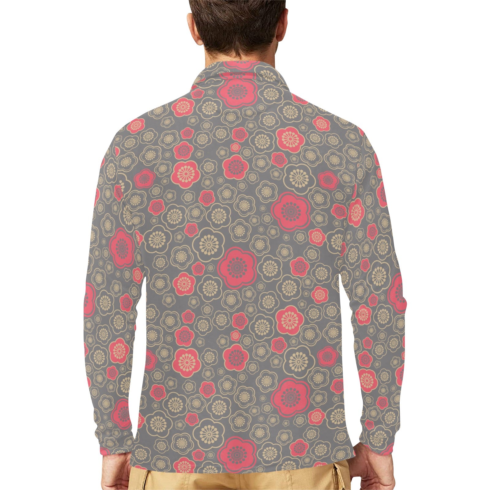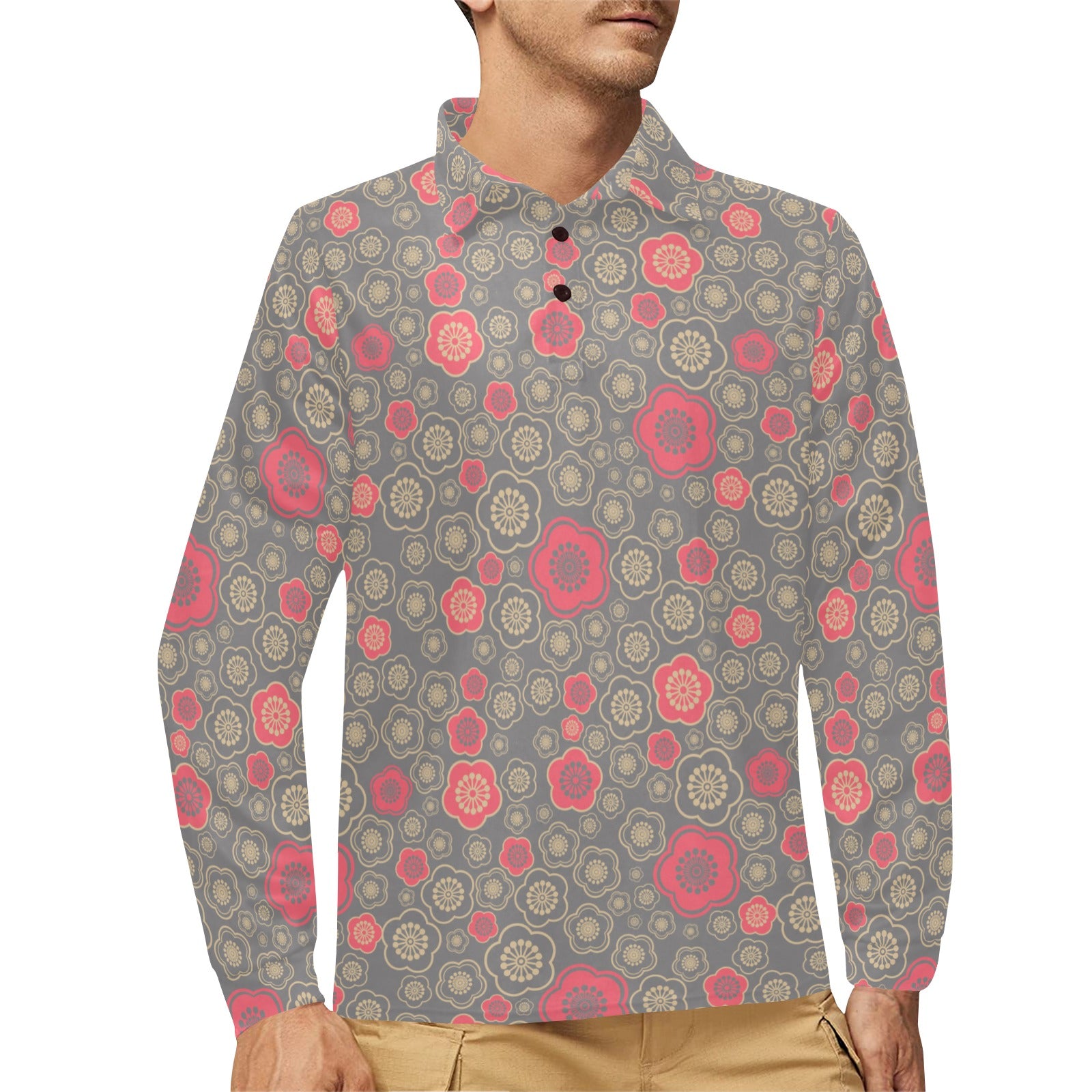 Red gold Sakura cherry blossom gray background Men's Long Sleeve Polo Shirt