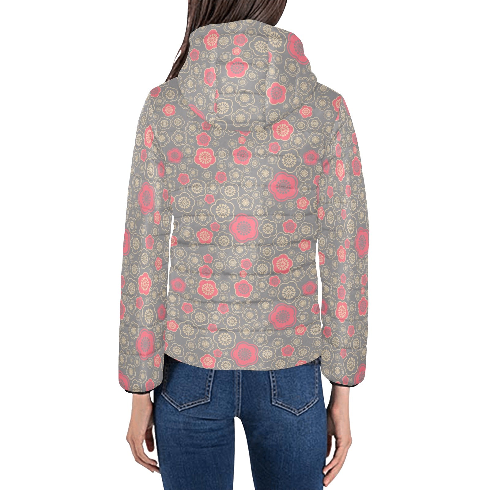 Red gold Sakura cherry blossom gray background Women's Padded Hooded Jacket