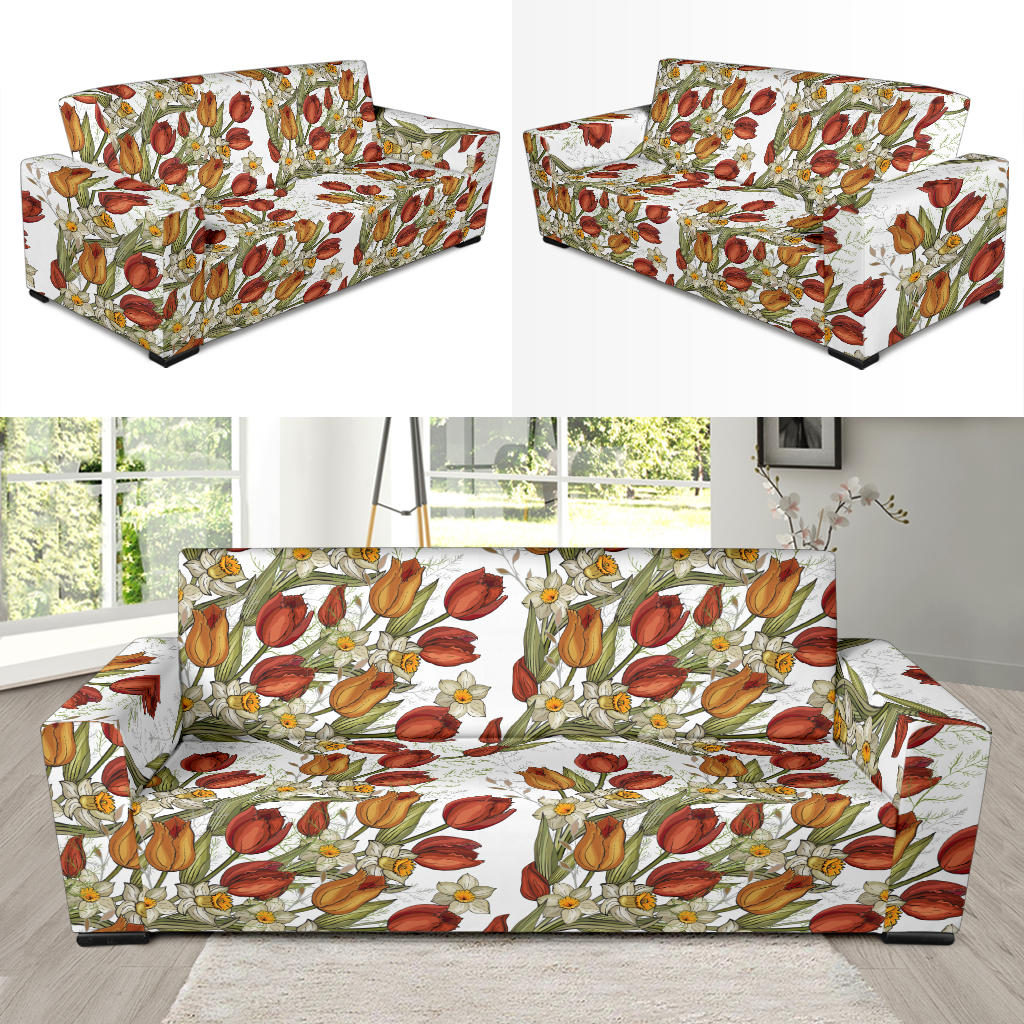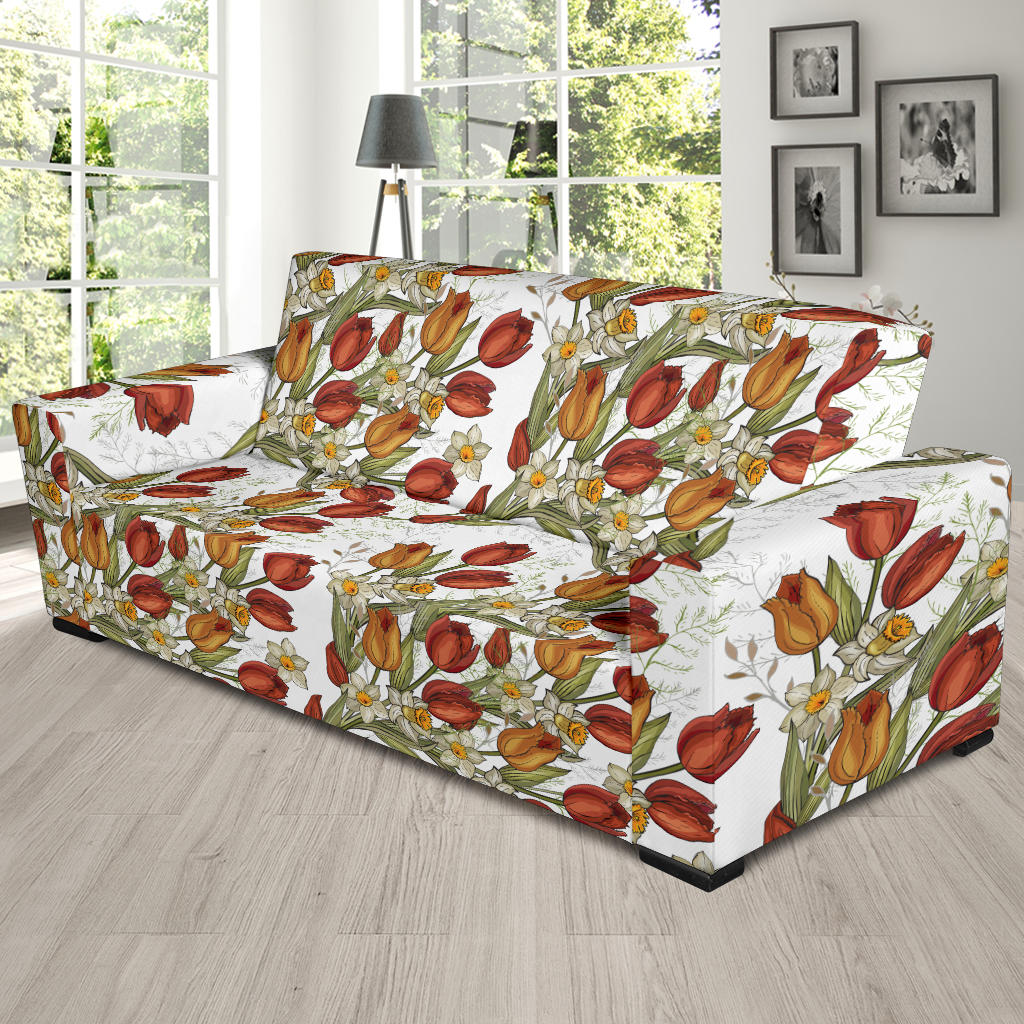Red Tulips And Daffodils Pattern Sofa Slipcover