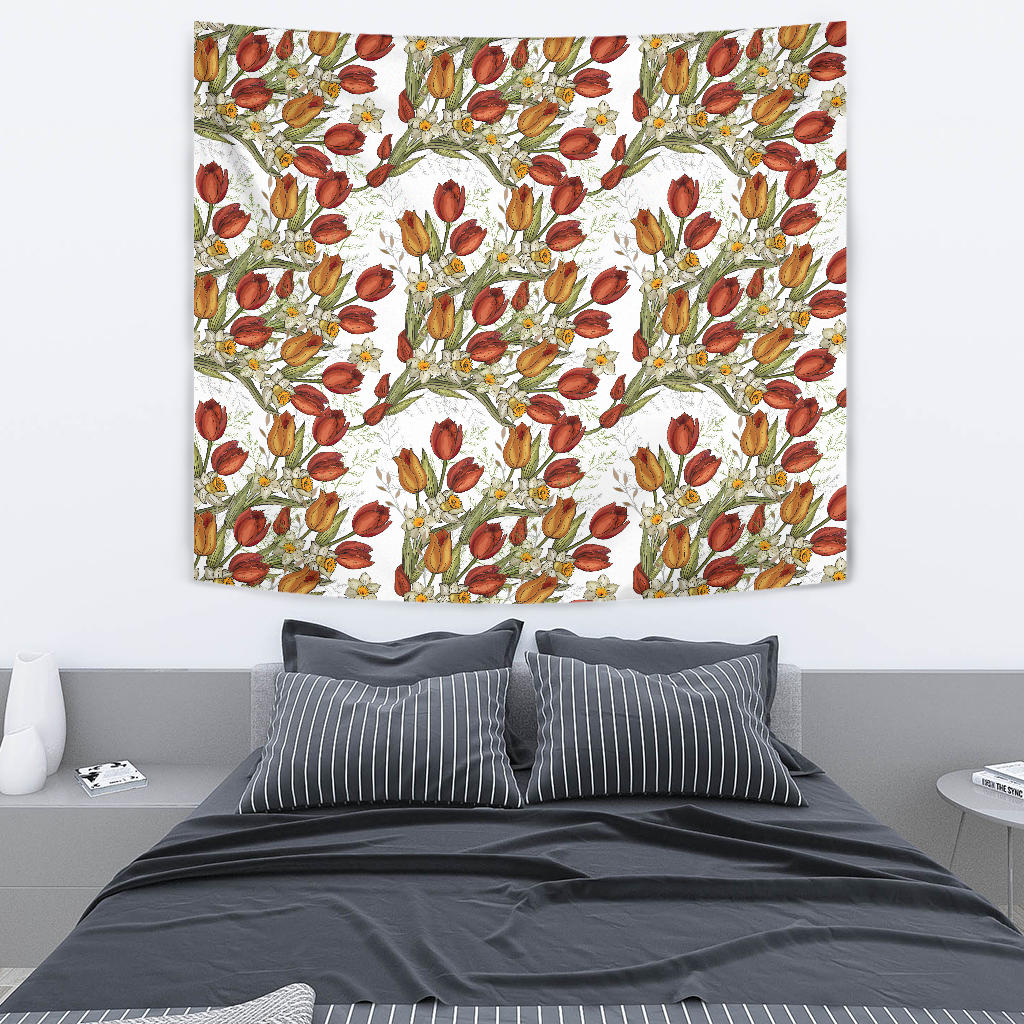 Red Tulips And Daffodils Pattern Wall Tapestry