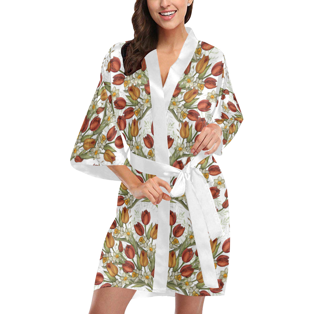 Red tulips and daffodils pattern Women's Short Kimono Robe is a uniqued design and limited item. It made to order, hand printed, and sewn with love in our factory.