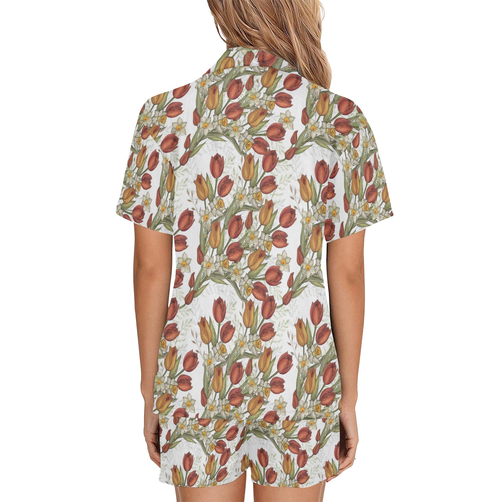 Red tulips and daffodils pattern Women's V-Neck Short Pajama Set