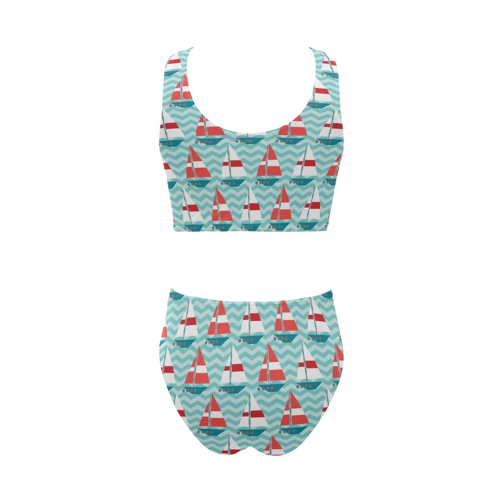 Red White sailboat wave background Chest Bowknot High Waisted Bikini Swimsuit
