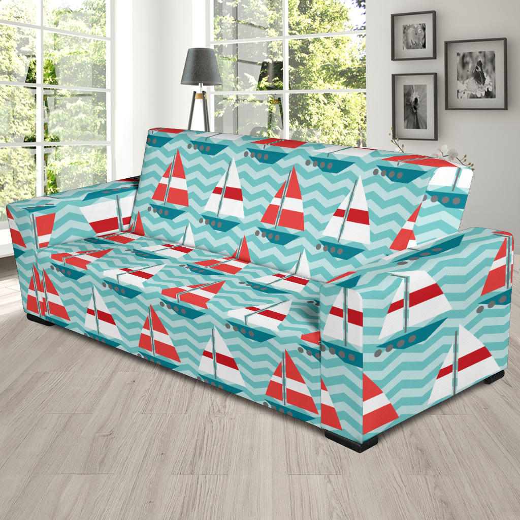 Red White sailboat wave background Sofa Slipcover is a uniqued design and limited item. It made to order, hand printed, and sewn with love in our factory.