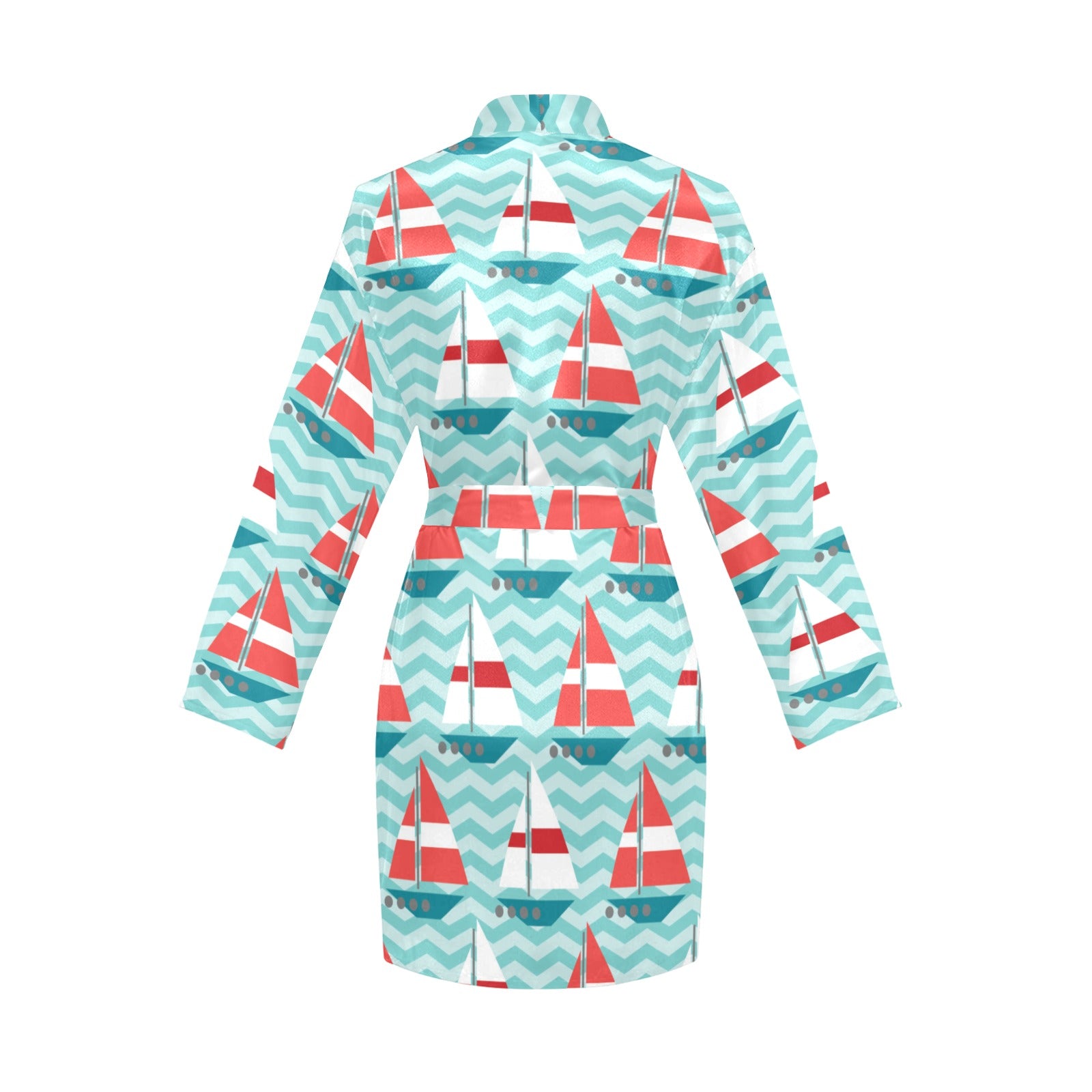 Red White sailboat wave background Women's Long Sleeve Belted Night Robe