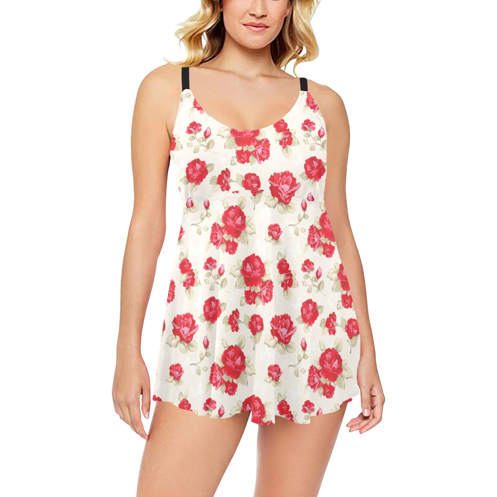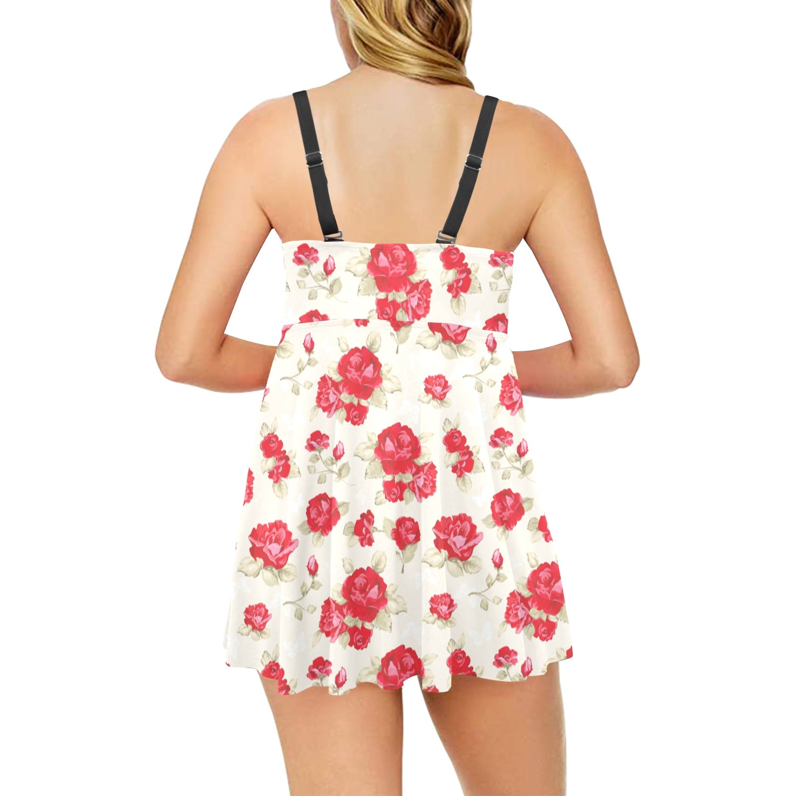 Rose Pattern Print Design 01 Chest Sexy Pleated Two Piece Swim Dress