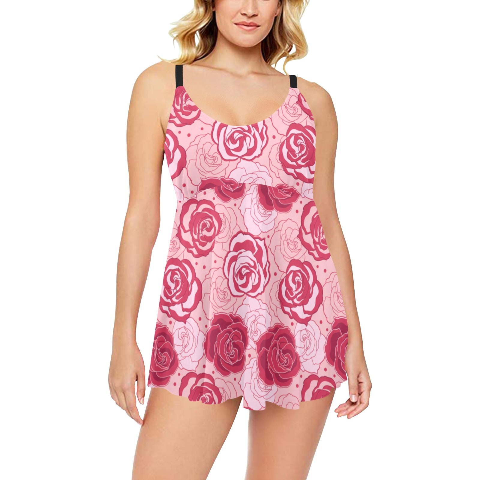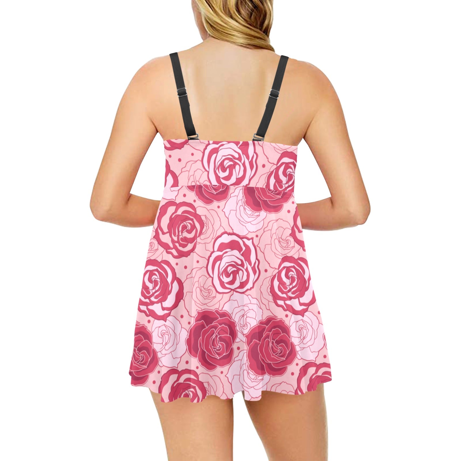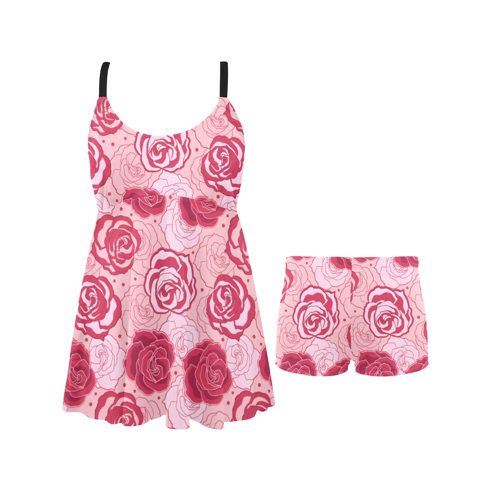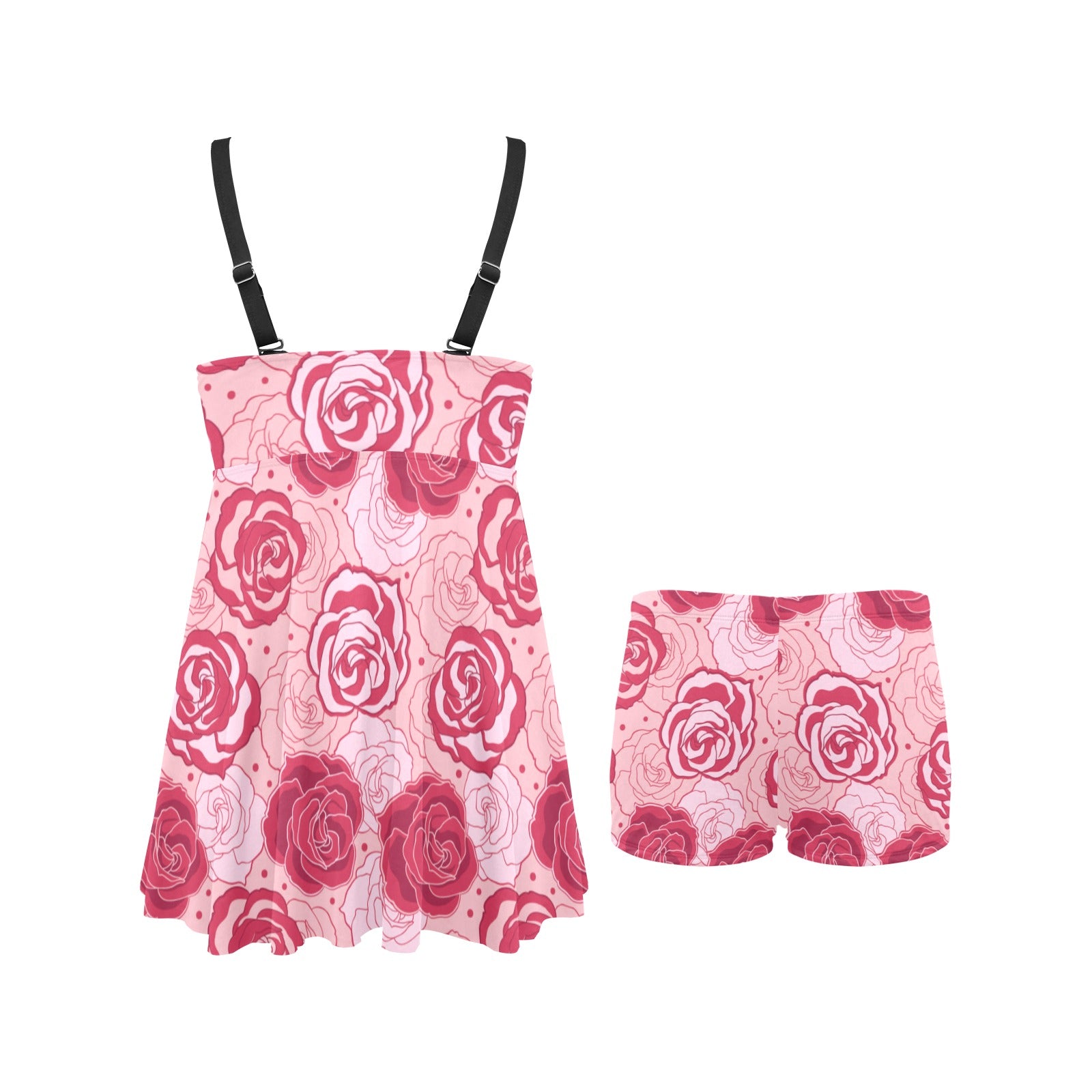 Rose Pattern Print Design 02 Chest Sexy Pleated Two Piece Swim Dress