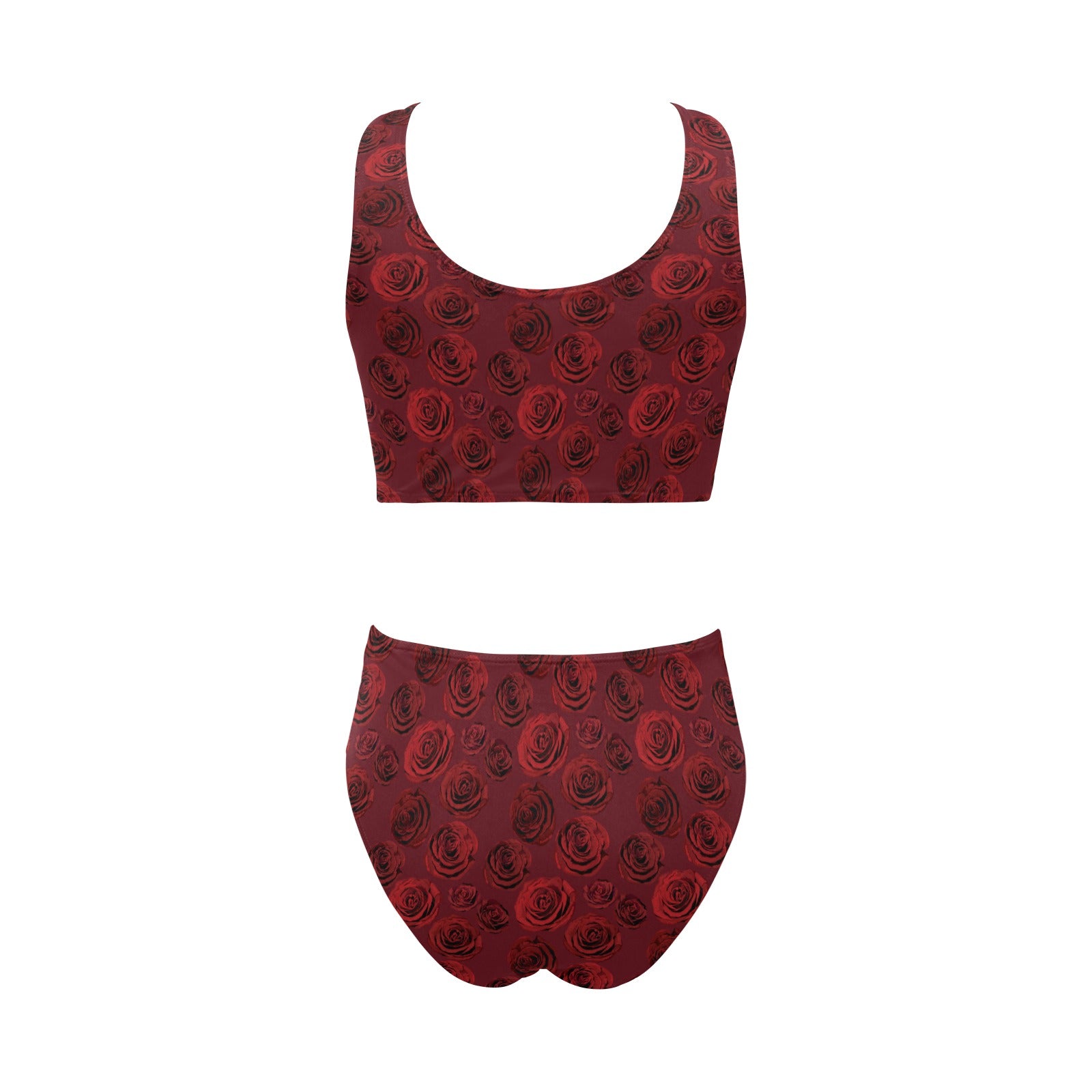 Rose Pattern Print Design 03 Chest Bowknot High Waisted Bikini Swimsuit