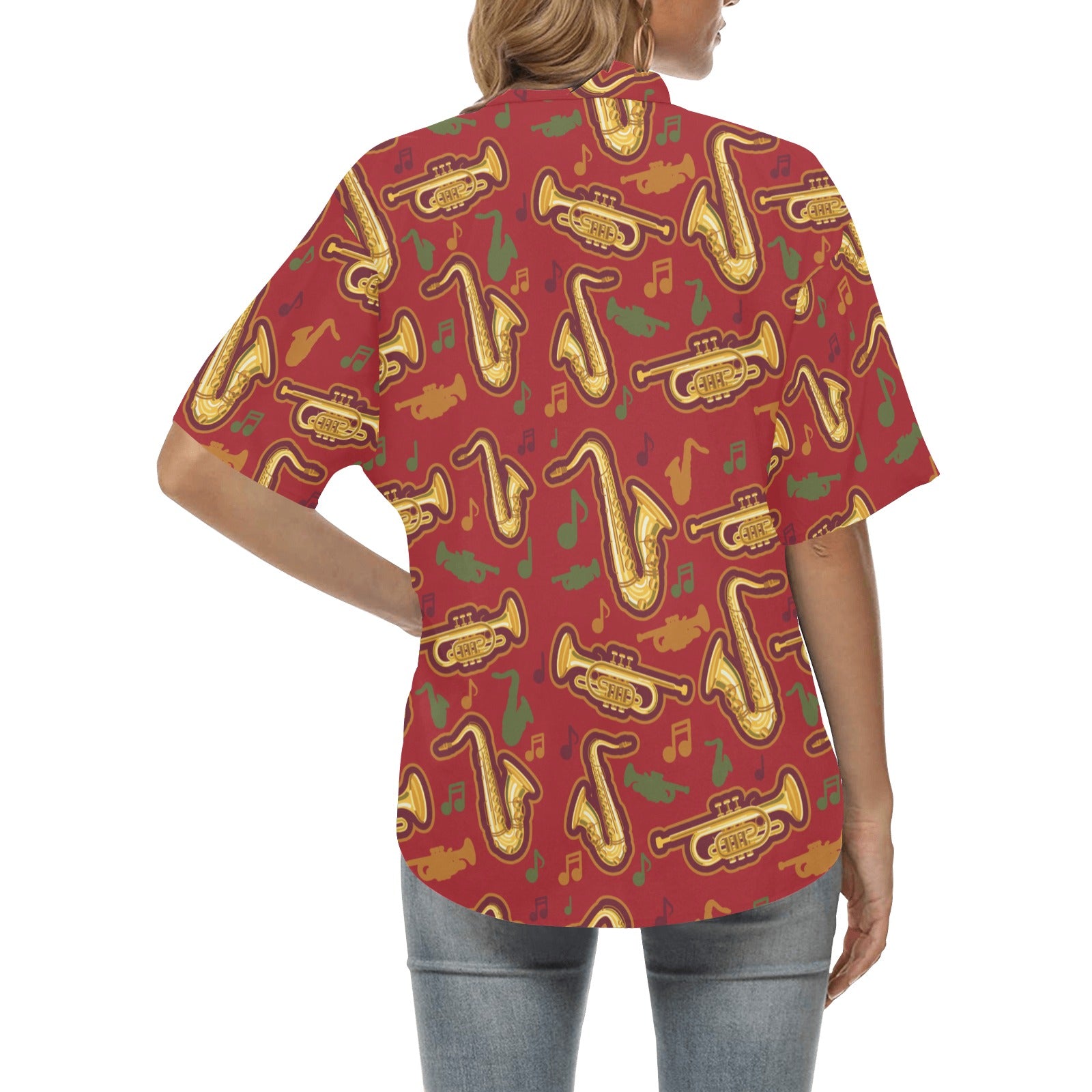 Saxophone cornet pattern red background Women's All Over Print Hawaiian Shirt