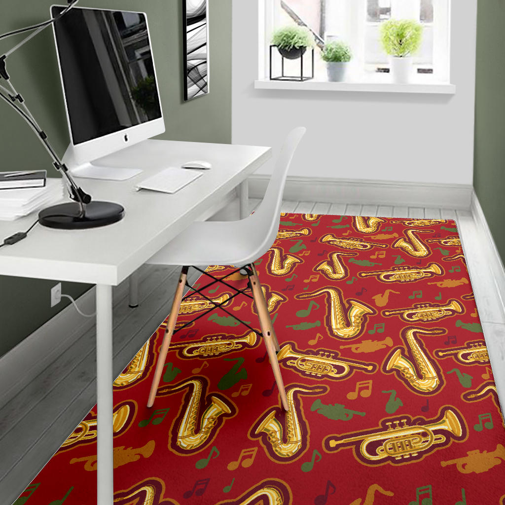 Saxophone cornet pattern red background Area Rug is a uniqued design and limited item. It made to order, hand printed, and sewn with love in our factory.
