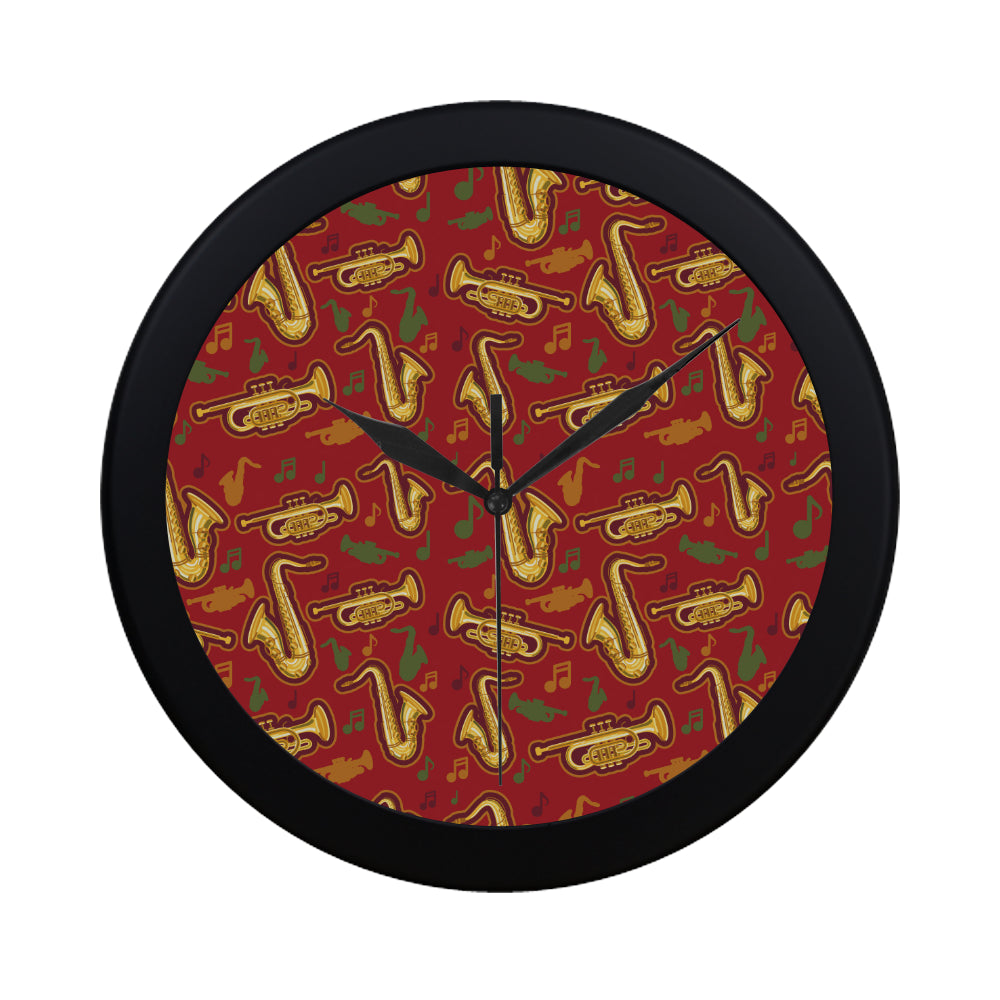 Saxophone cornet pattern red background Elegant Black Wall Clock