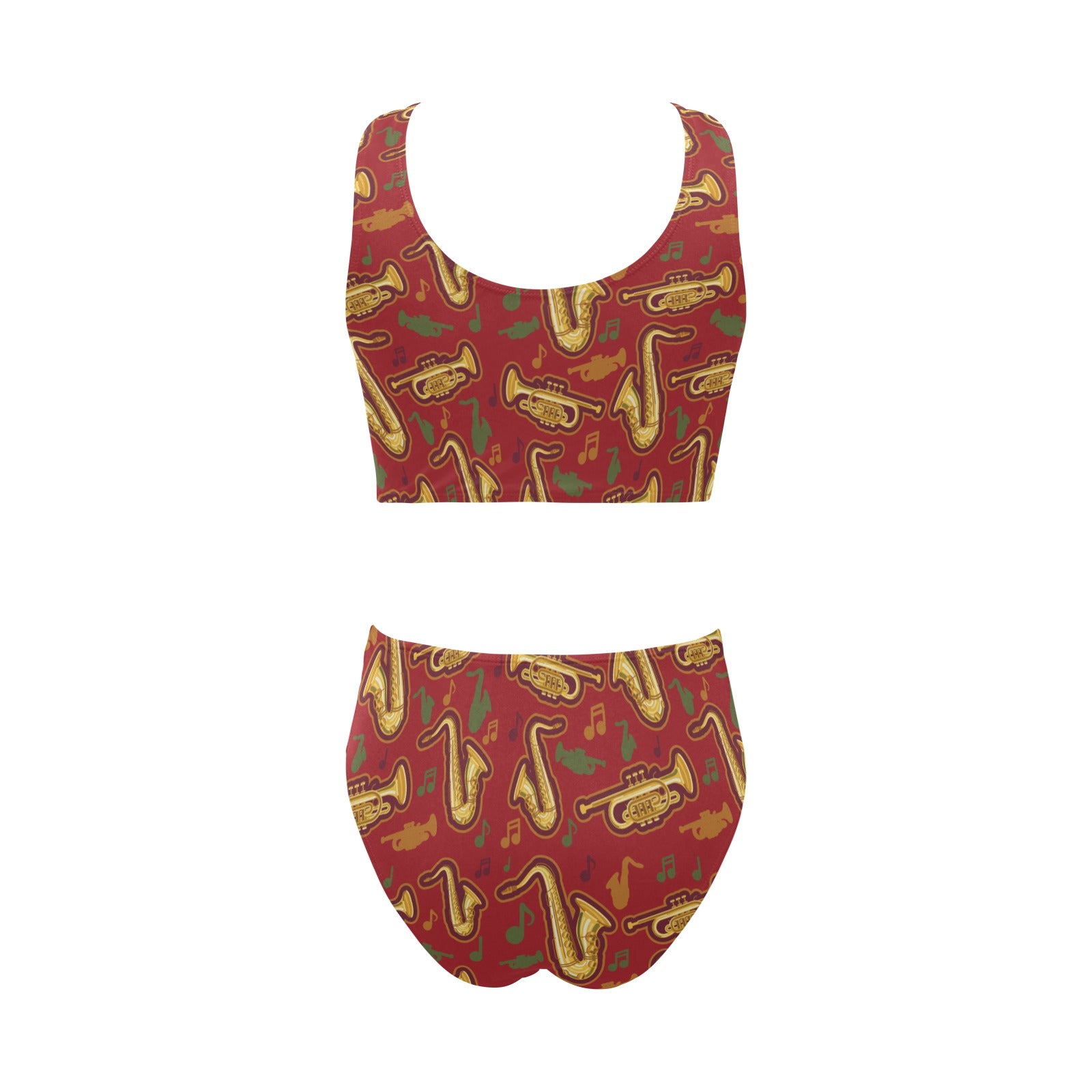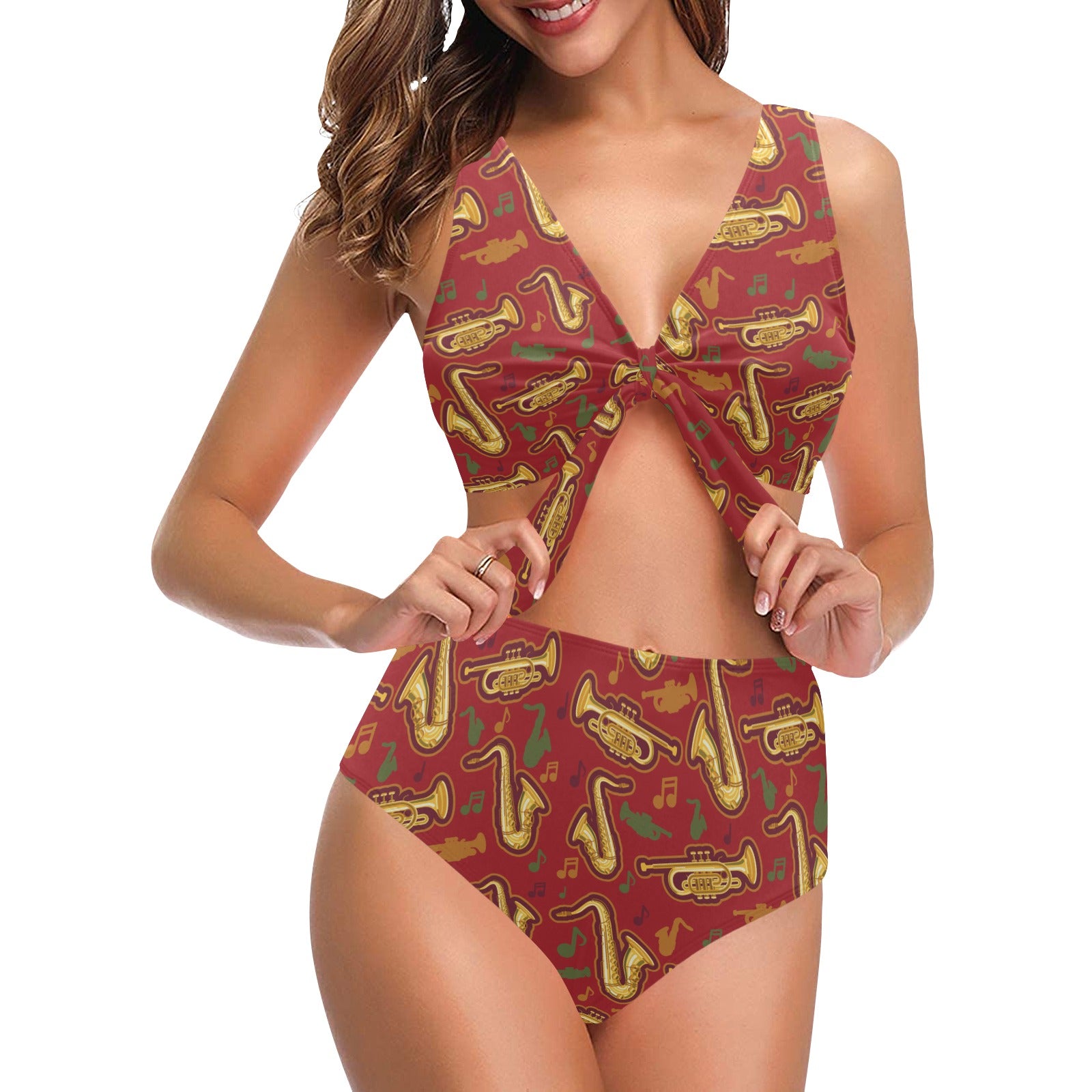 Saxophone cornet pattern red background Chest Bowknot High Waisted Bikini Swimsuit