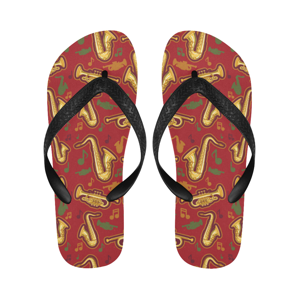 Saxophone cornet pattern red background Unisex Flip Flops is a uniqued design and limited item. It made to order, hand printed, and sewn with love in our factory.