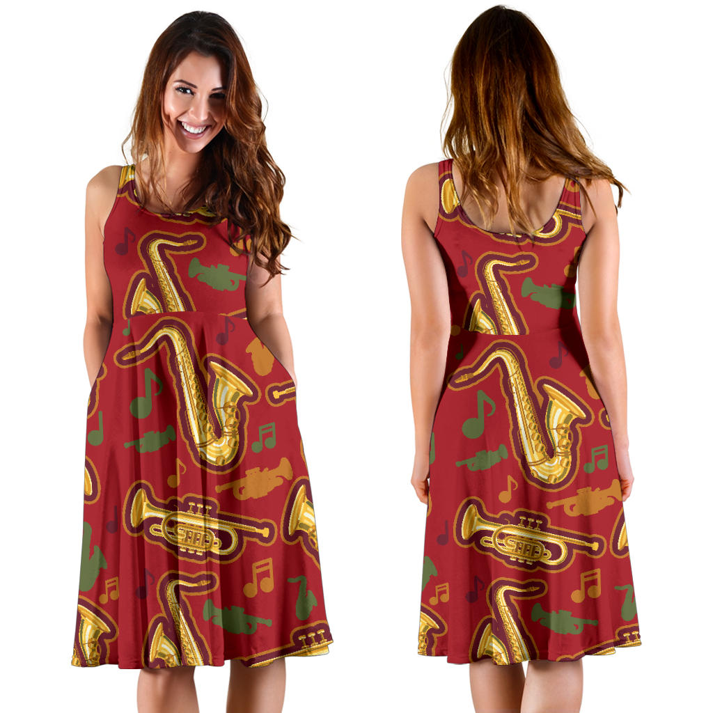 Saxophone cornet pattern red background Sleeveless Midi Dress is a uniqued design and limited item. It made to order, hand printed, and sewn with love in our factory.