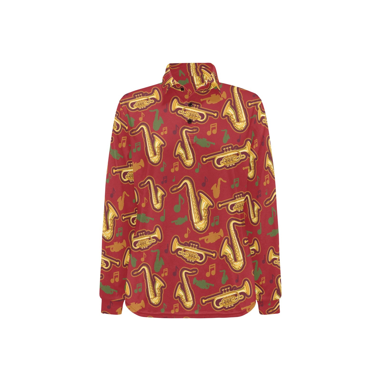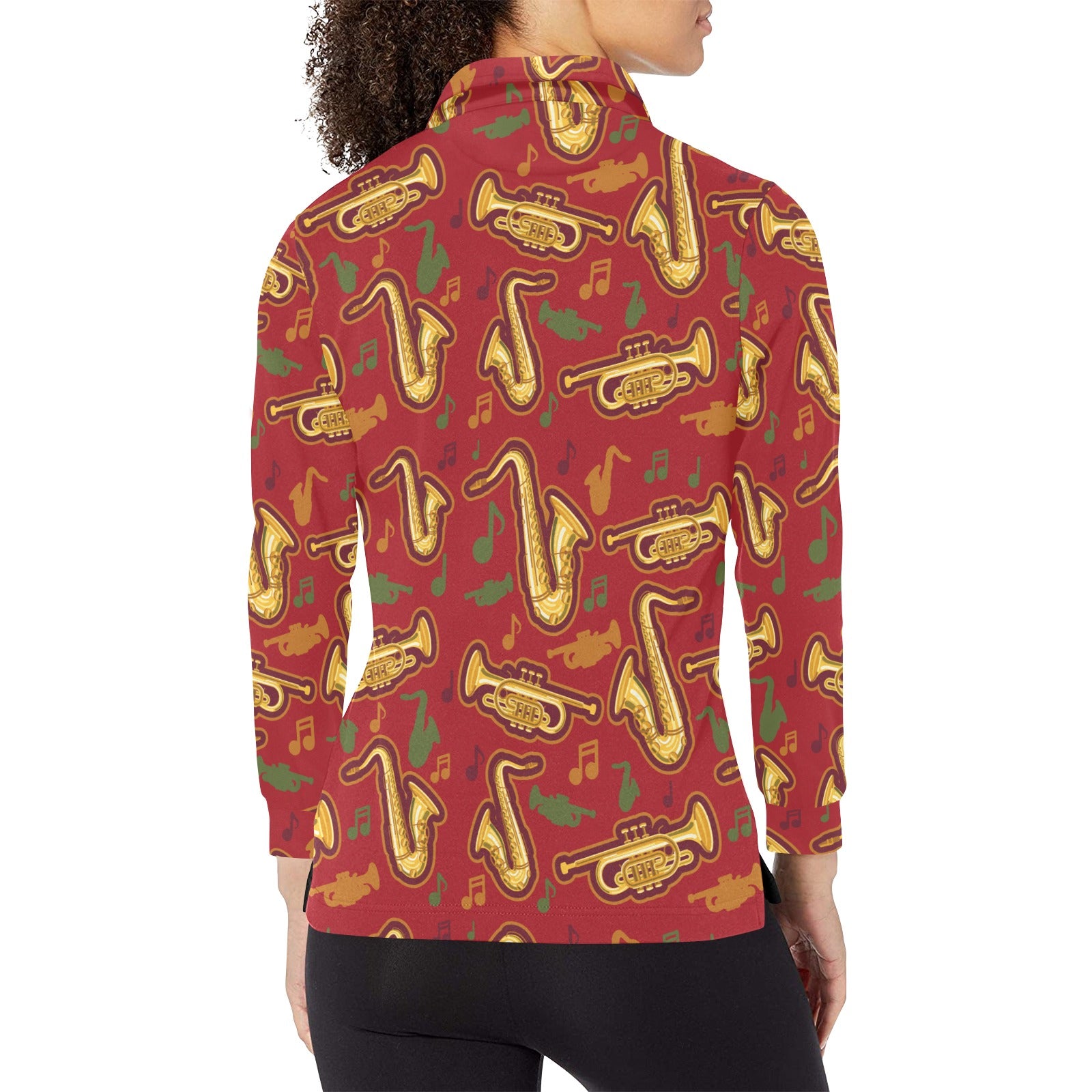 Saxophone cornet pattern red background Women's Long Sleeve Polo Shirt