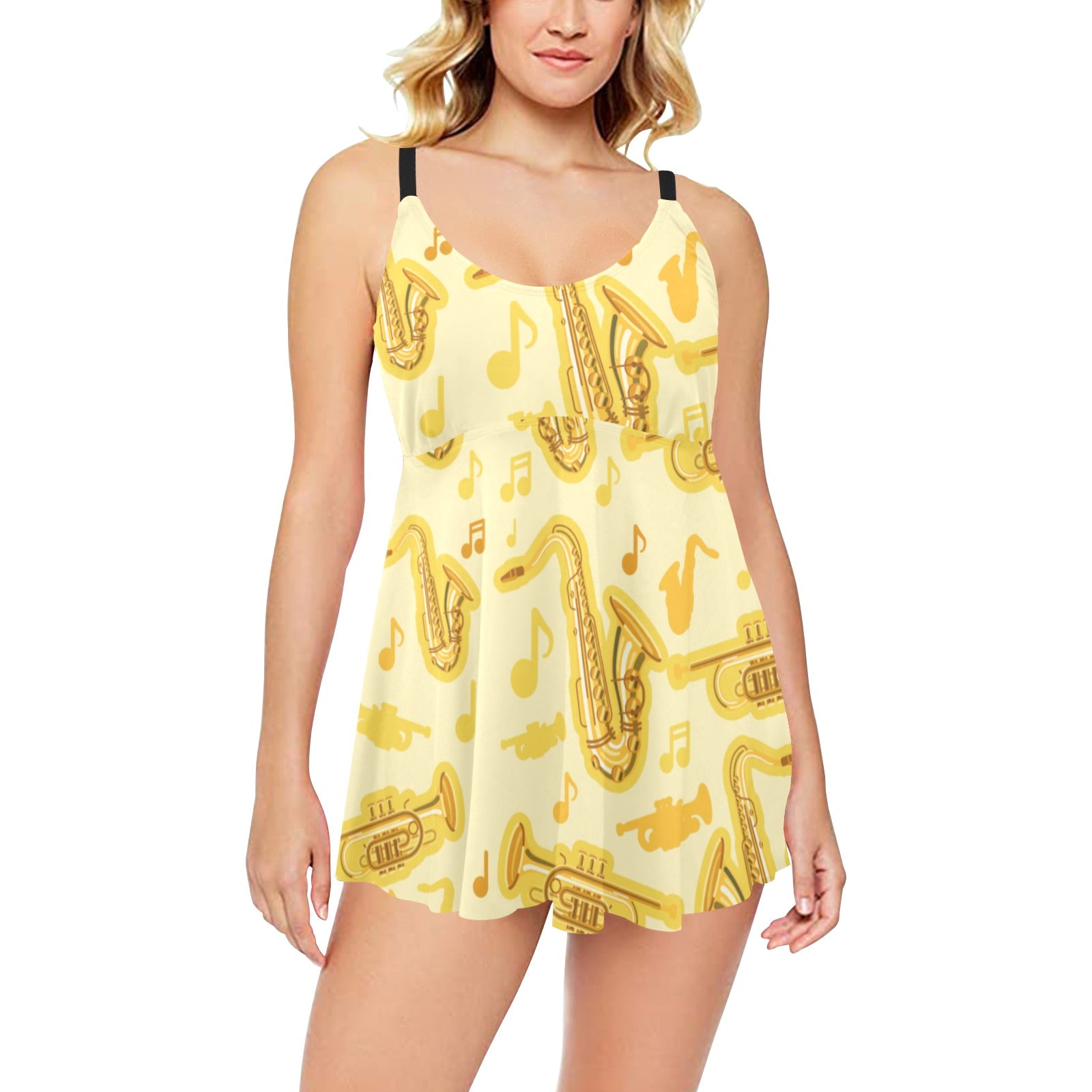 Saxophone cornet pattern yellow background Chest Sexy Pleated Two Piece Swim Dress