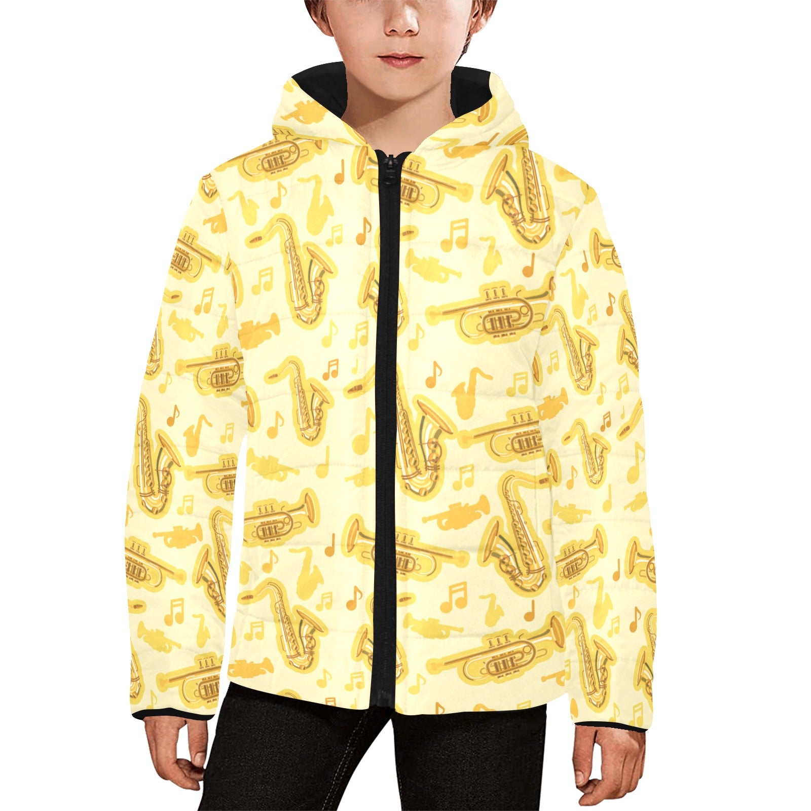 Saxophone cornet pattern yellow background Kids' Boys' Girls' Padded Hooded Jacket