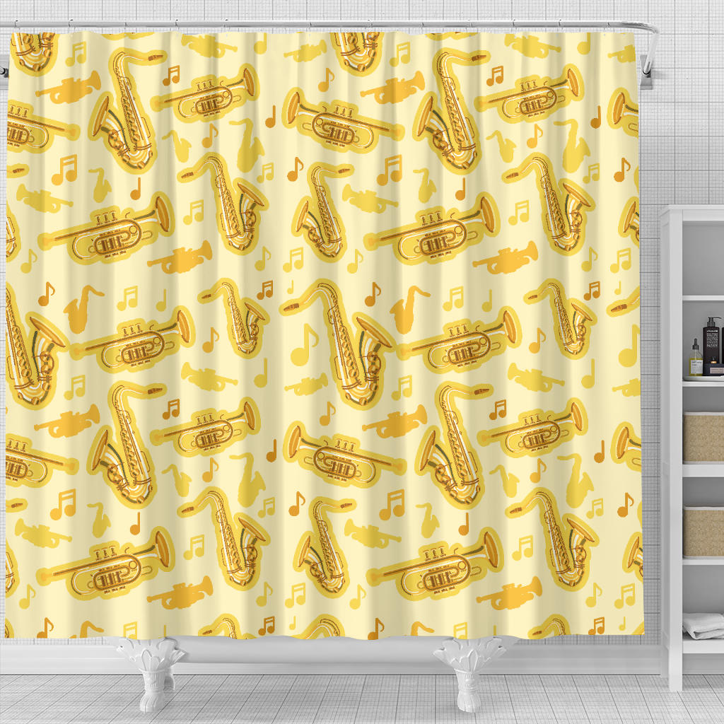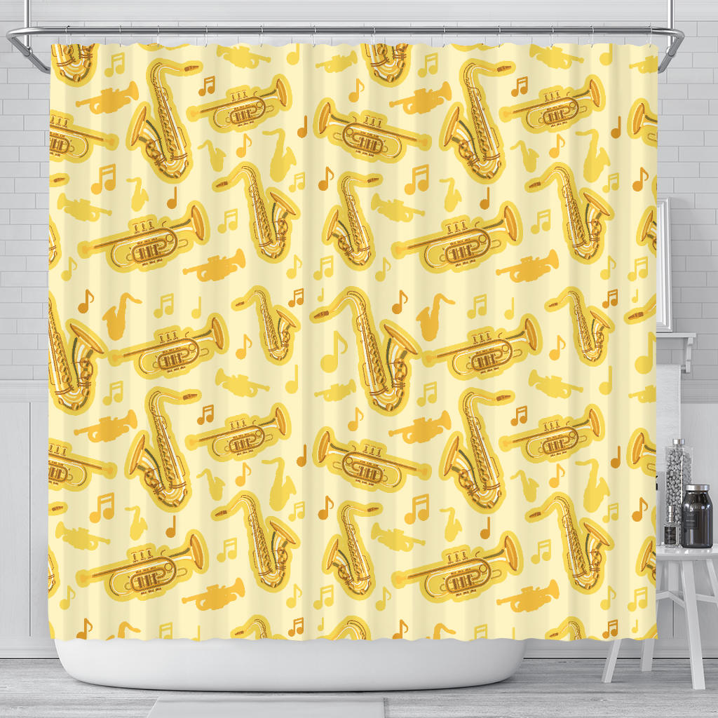 Saxophone cornet pattern yellow background Shower Curtain is a uniqued design and limited item. It made to order, hand printed, and sewn with love in our factory.