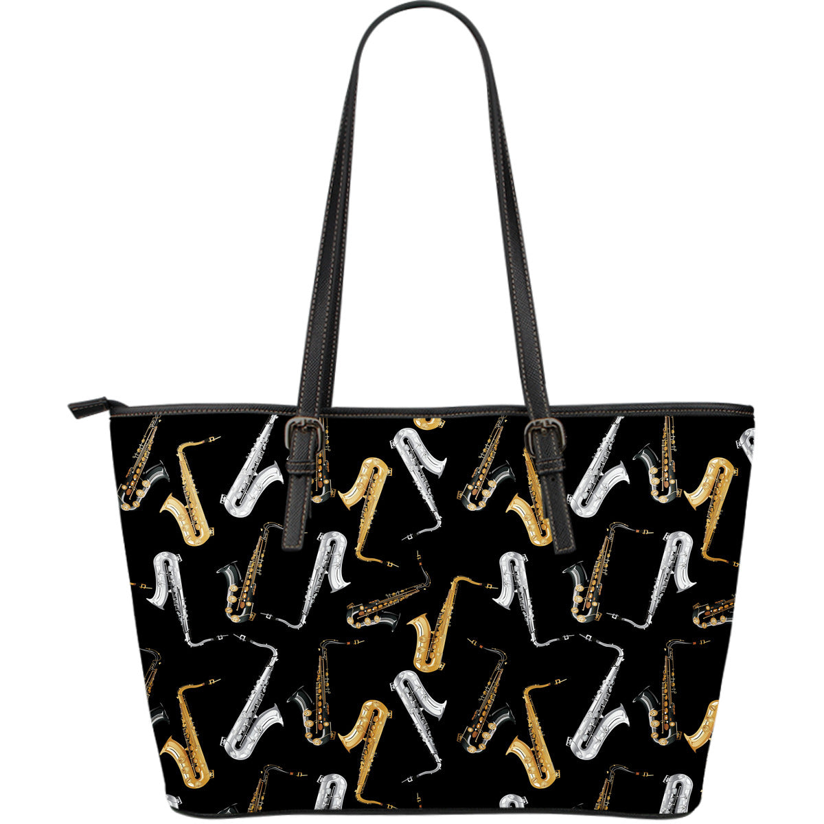 saxophone design pattern Large Leather Tote Bag is a uniqued design and limited item. It made to order, hand printed, and sewn with love in our factory.