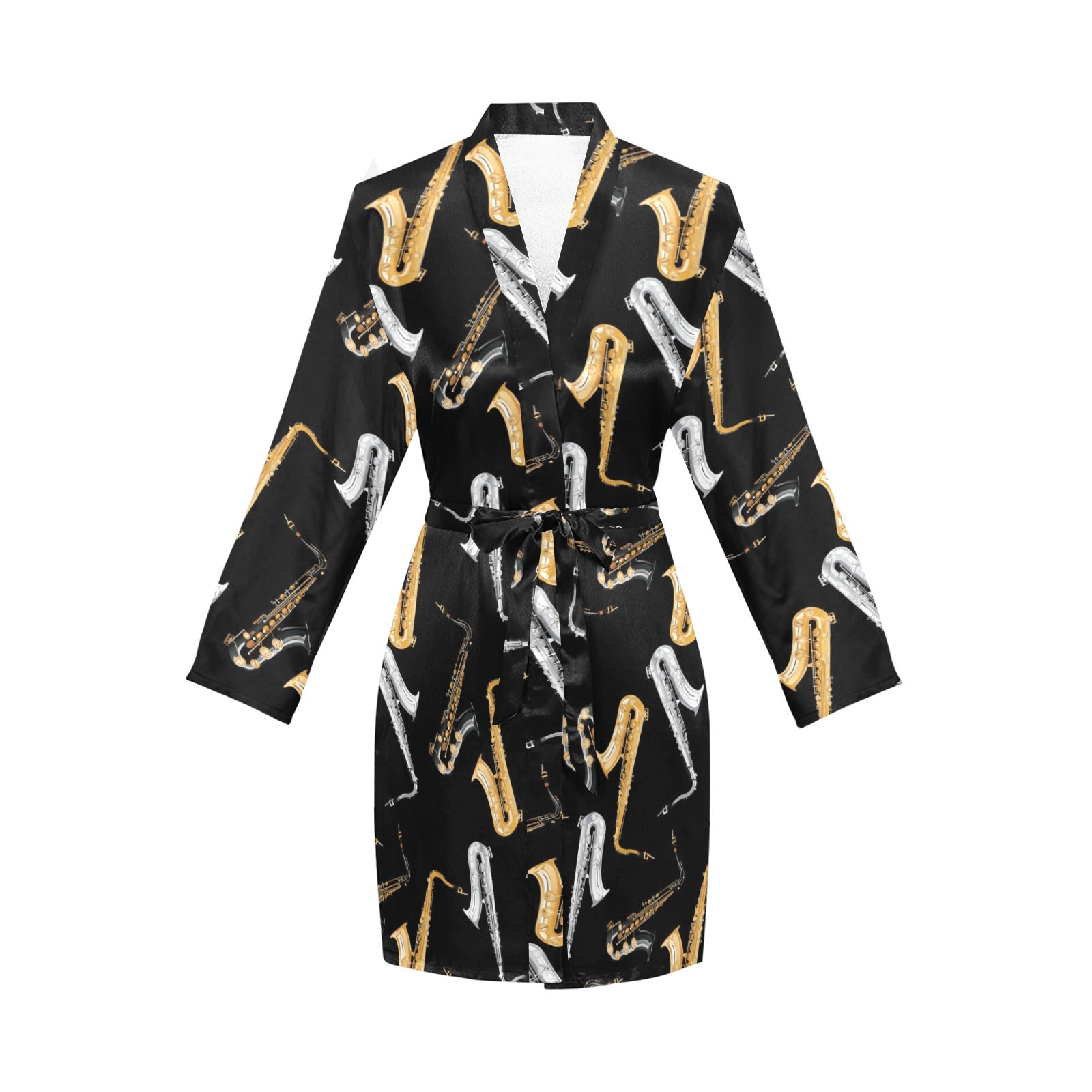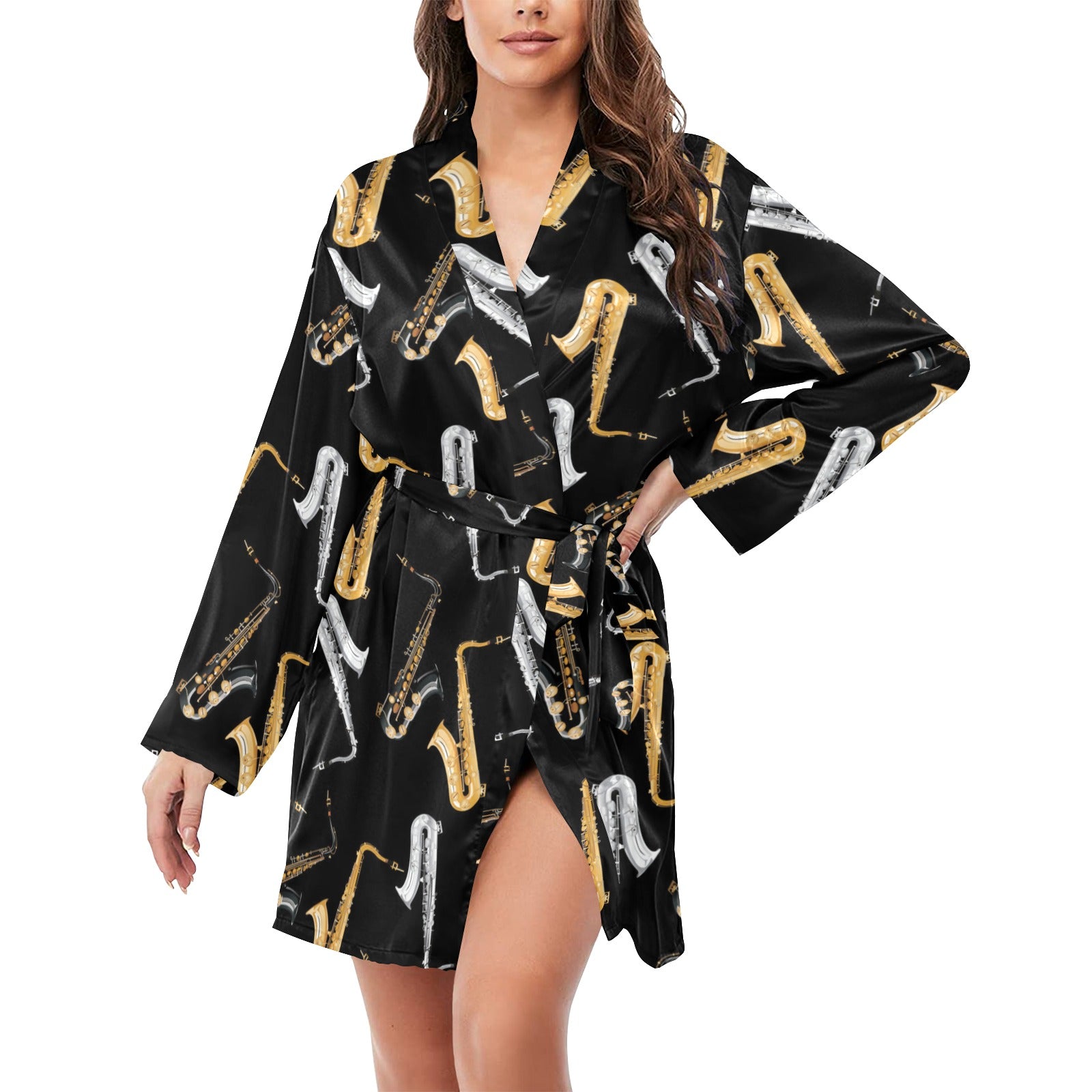 saxophone design pattern Women's Long Sleeve Belted Night Robe