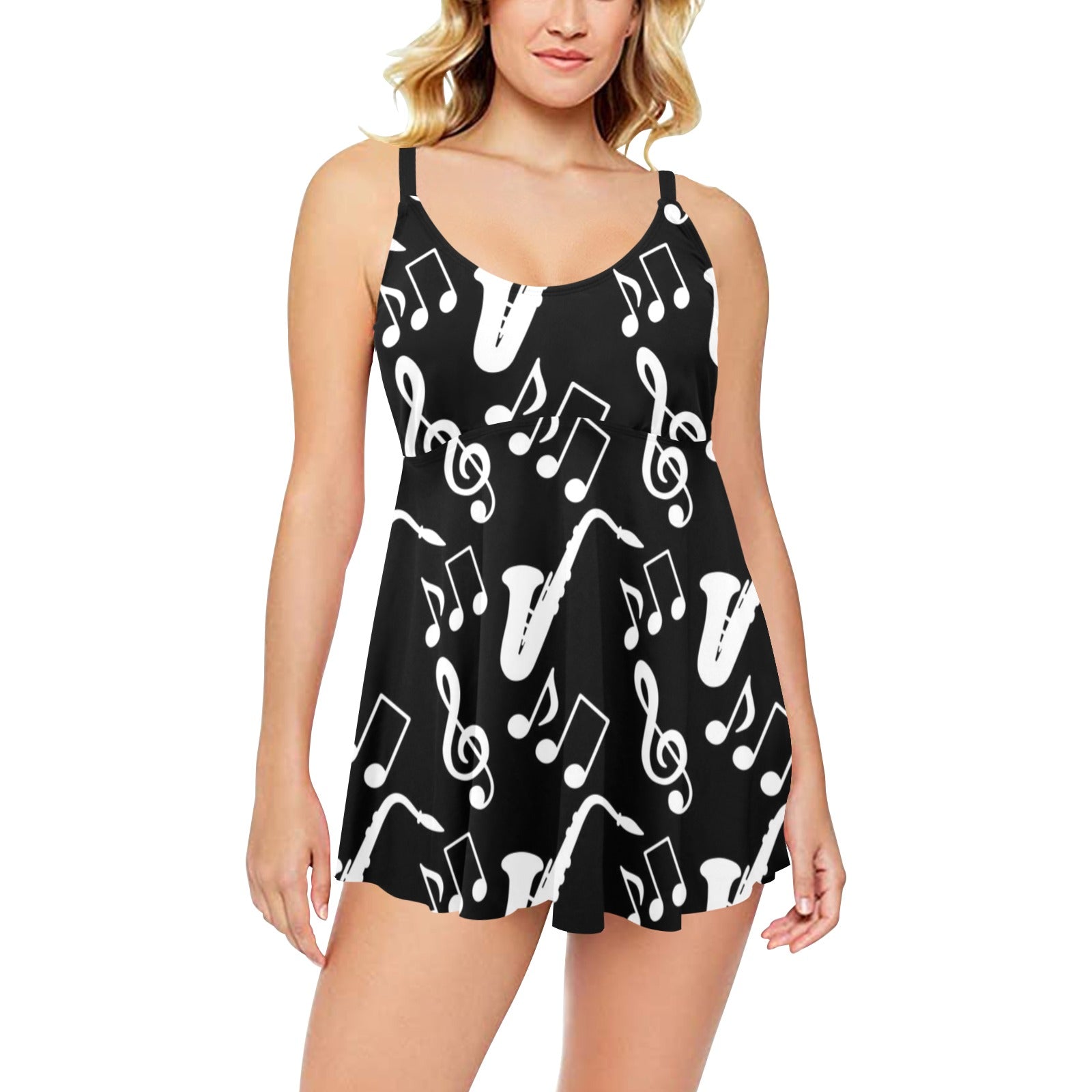 Saxophone music notes treble clef black white them Chest Sexy Pleated Two Piece Swim Dress