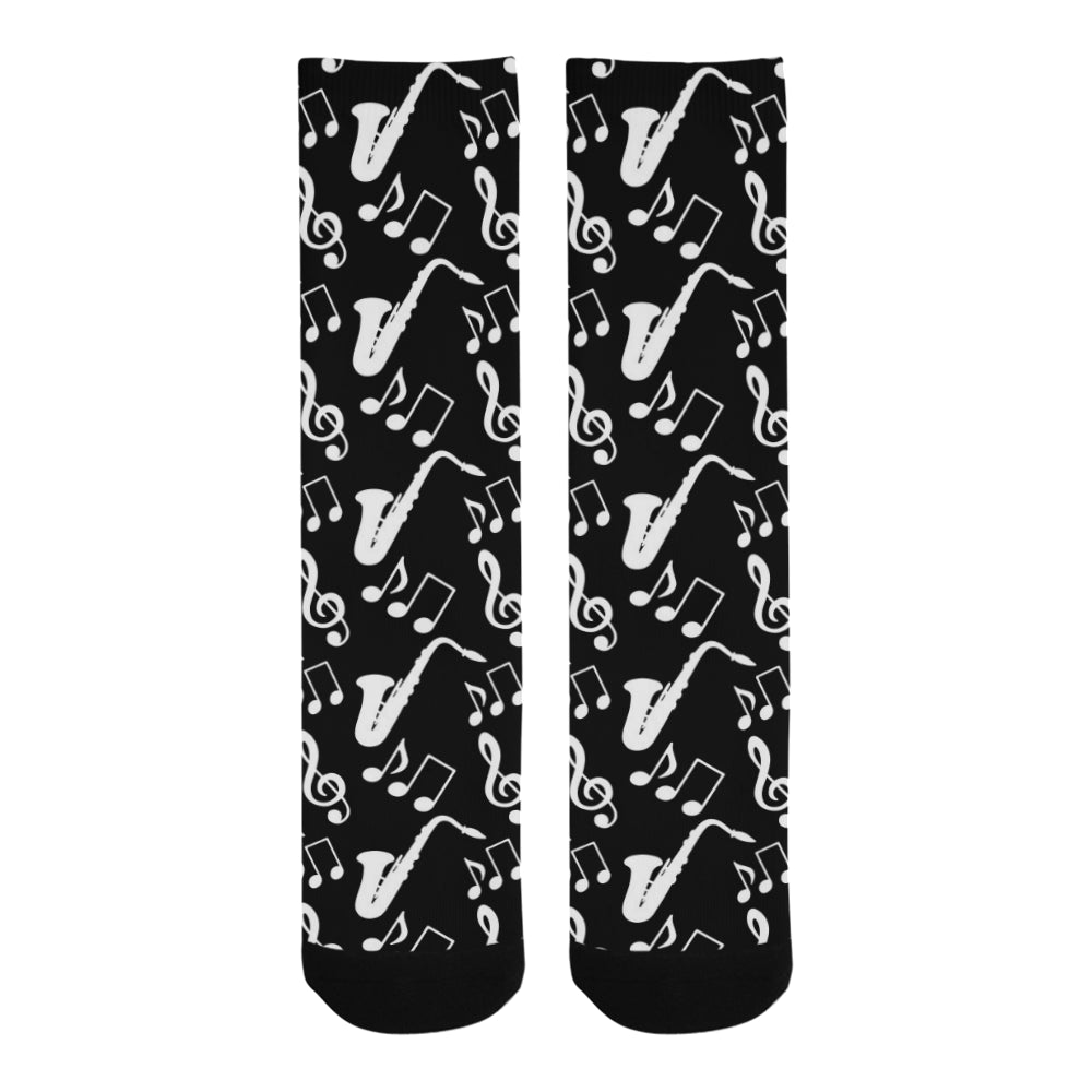 Saxophone music notes treble clef black white them Crew Socks are uniqued design and limited item. It made to order, hand printed, and sewn with love in our factory.
