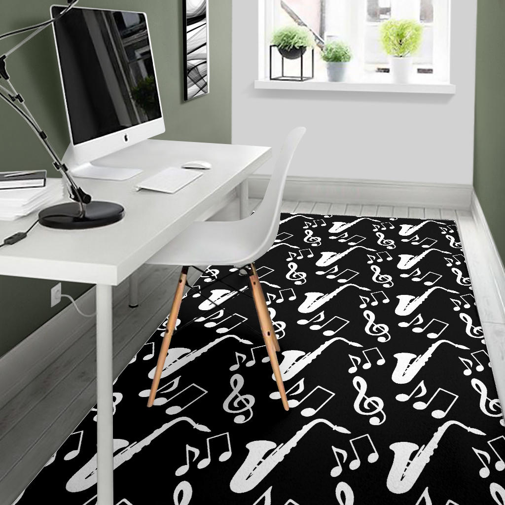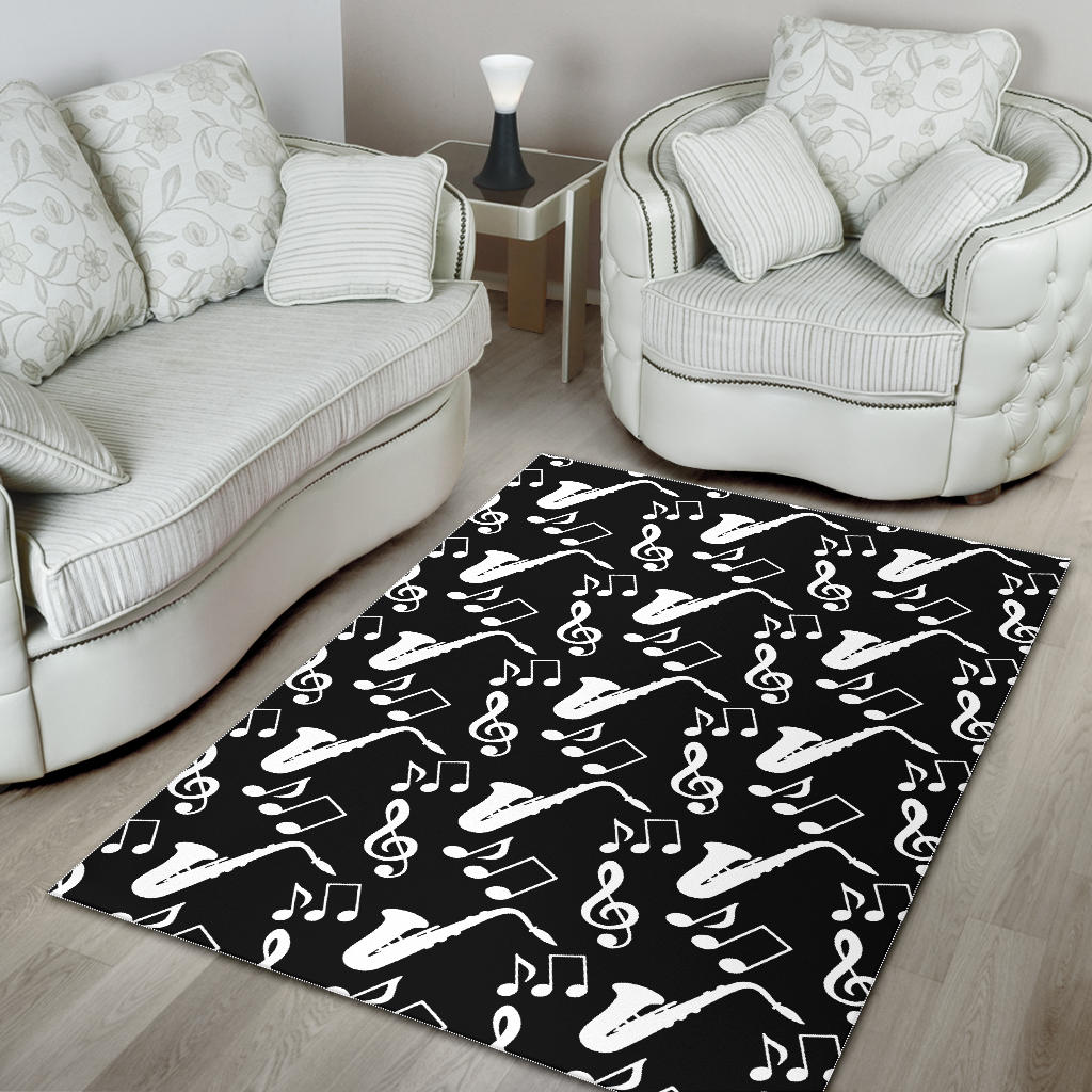 Saxophone music notes treble clef black white theme Area Rug is a uniqued design and limited item. It made to order, hand printed, and sewn with love in our factory.