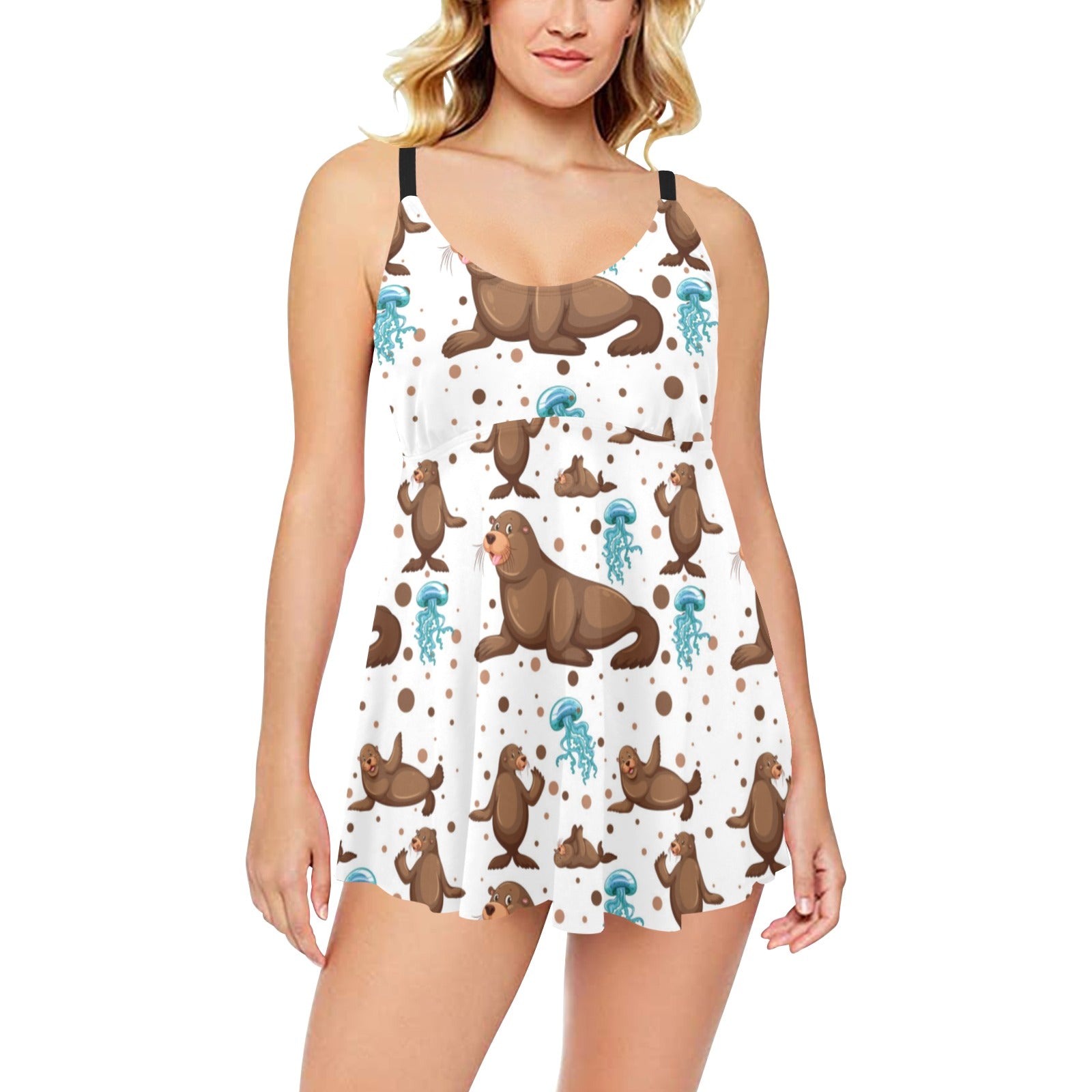 sea lion Seals jellyfish pattern Chest Sexy Pleated Two Piece Swim Dress