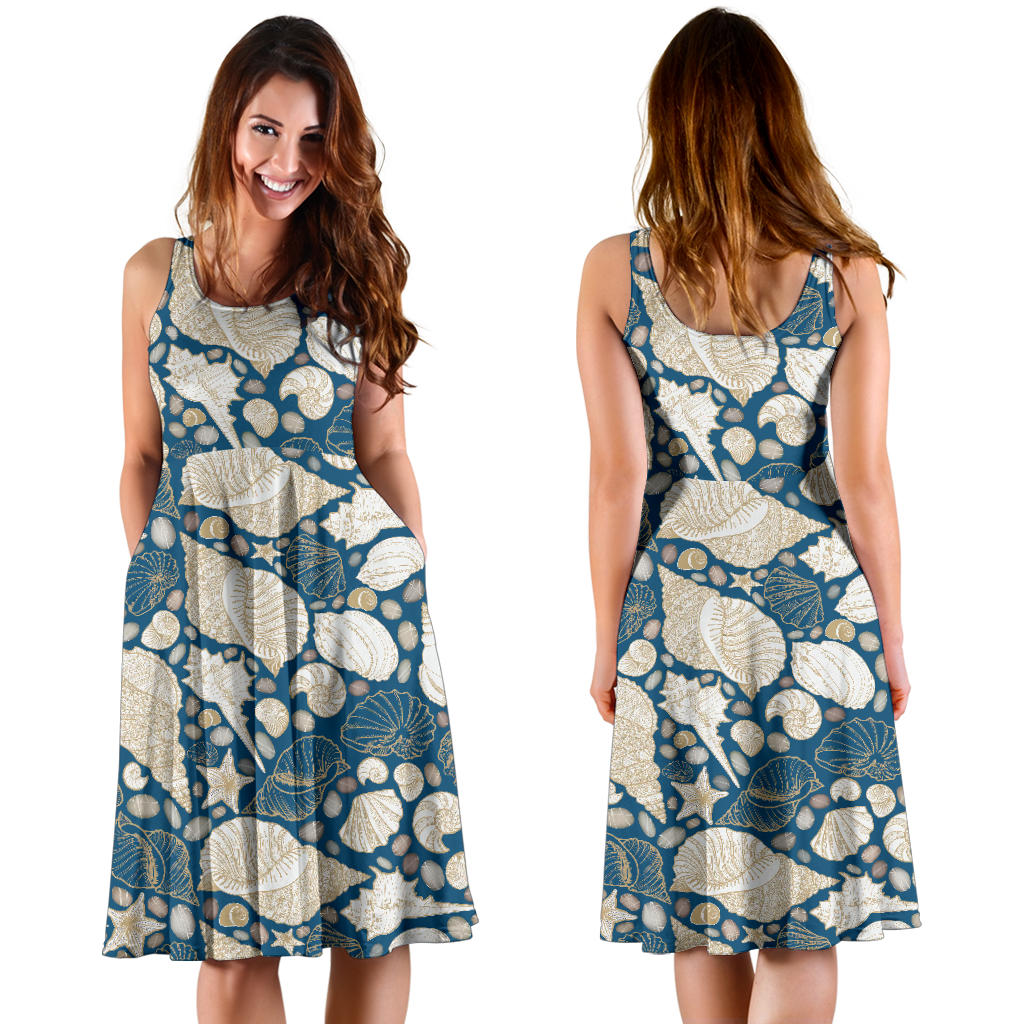 Shell Polynesian Tribal design pattern Sleeveless Midi Dress is a uniqued design and limited item. It made to order, hand printed, and sewn with love in our factory.