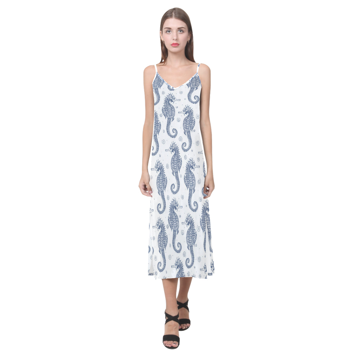 Seahorse pattern background V-Neck Open Fork Long Dress