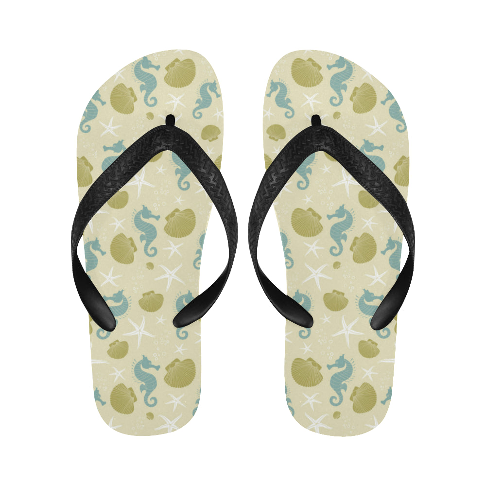 Seahorse shell starfish pattern background Unisex Flip Flops is a uniqued design and limited item. It made to order, hand printed, and sewn with love in our factory.