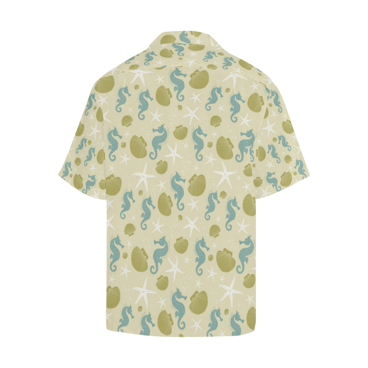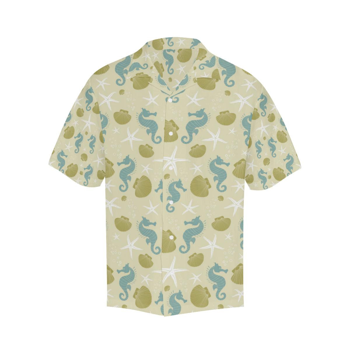 Seahorse shell starfish pattern background Men's All Over Print Hawaiian Shirt is a uniqued design and limited item. It made to order, hand printed, and sewn with love in our factory.