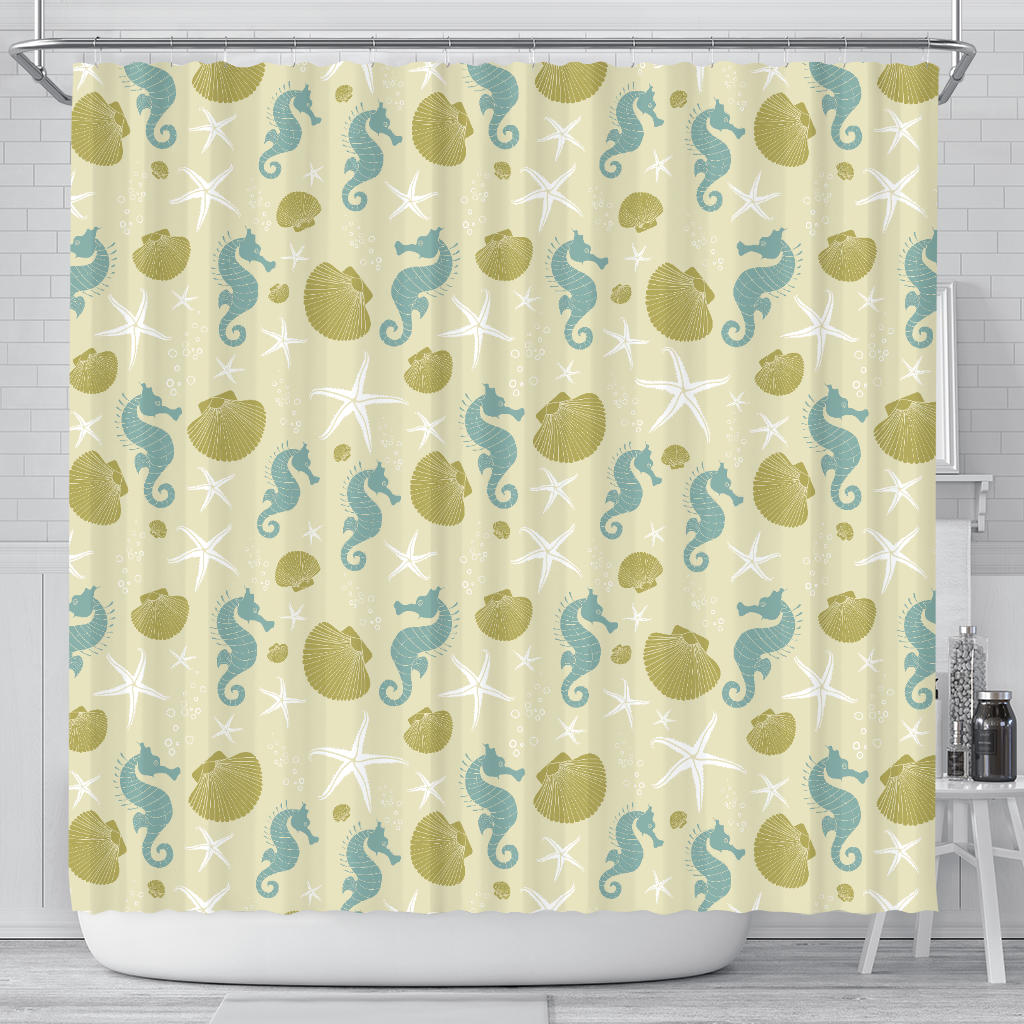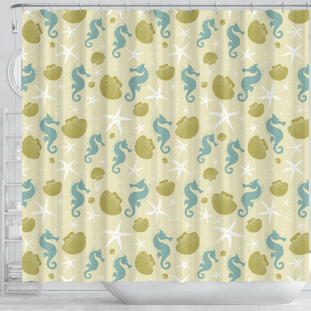Seahorse shell starfish pattern background Shower Curtain is a uniqued design and limited item. It made to order, hand printed, and sewn with love in our factory.