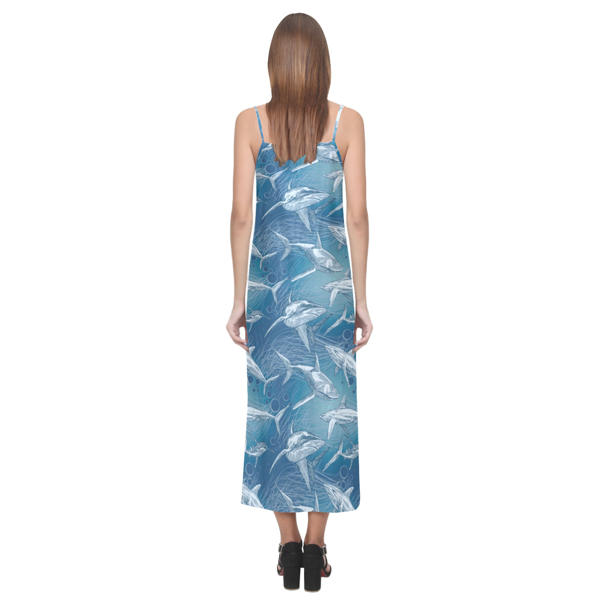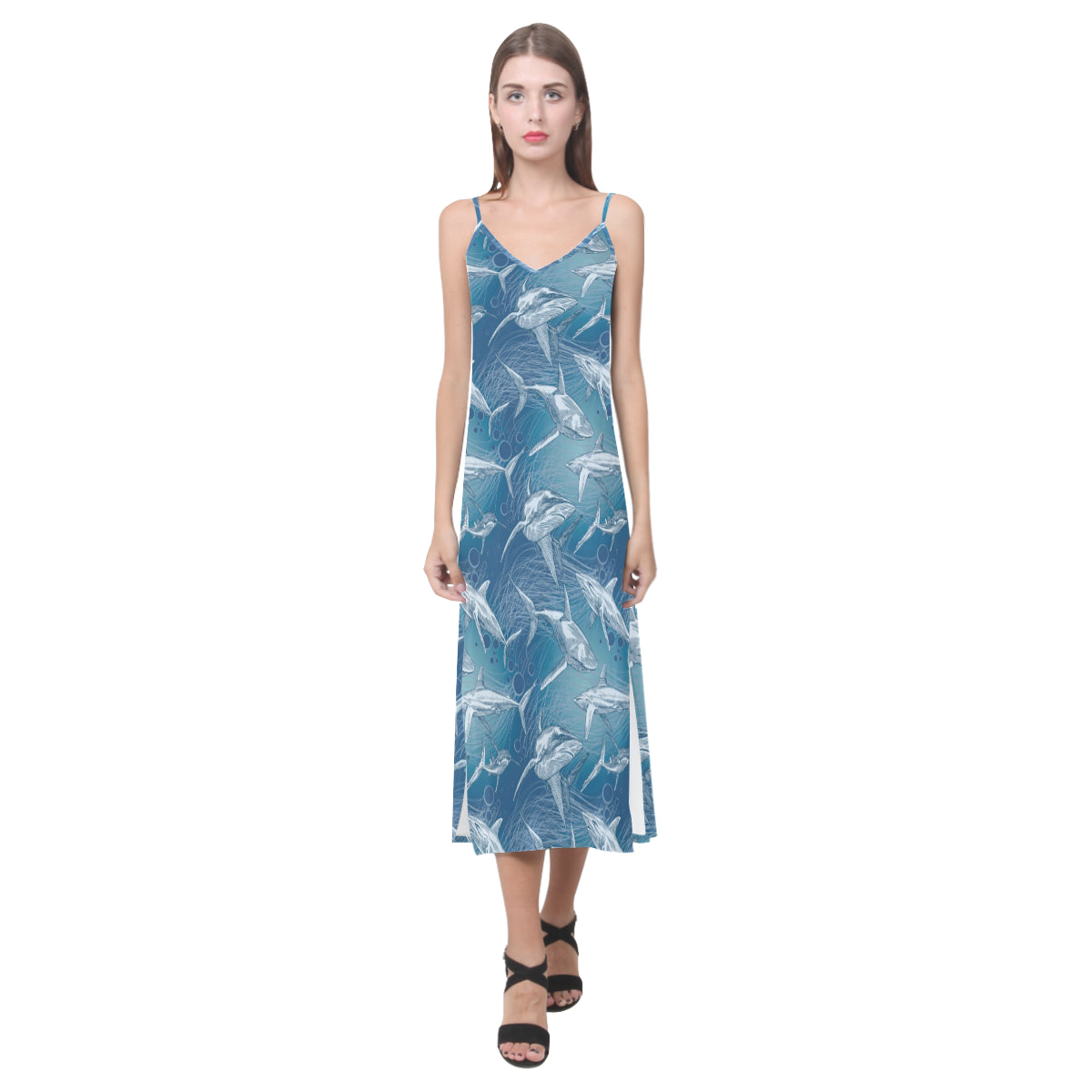 Shark hand drawn V-Neck Open Fork Long Dress