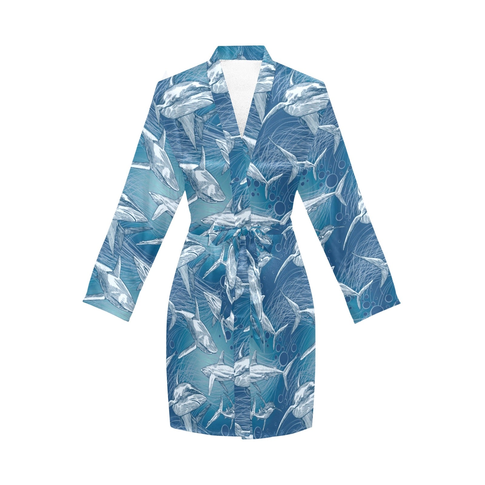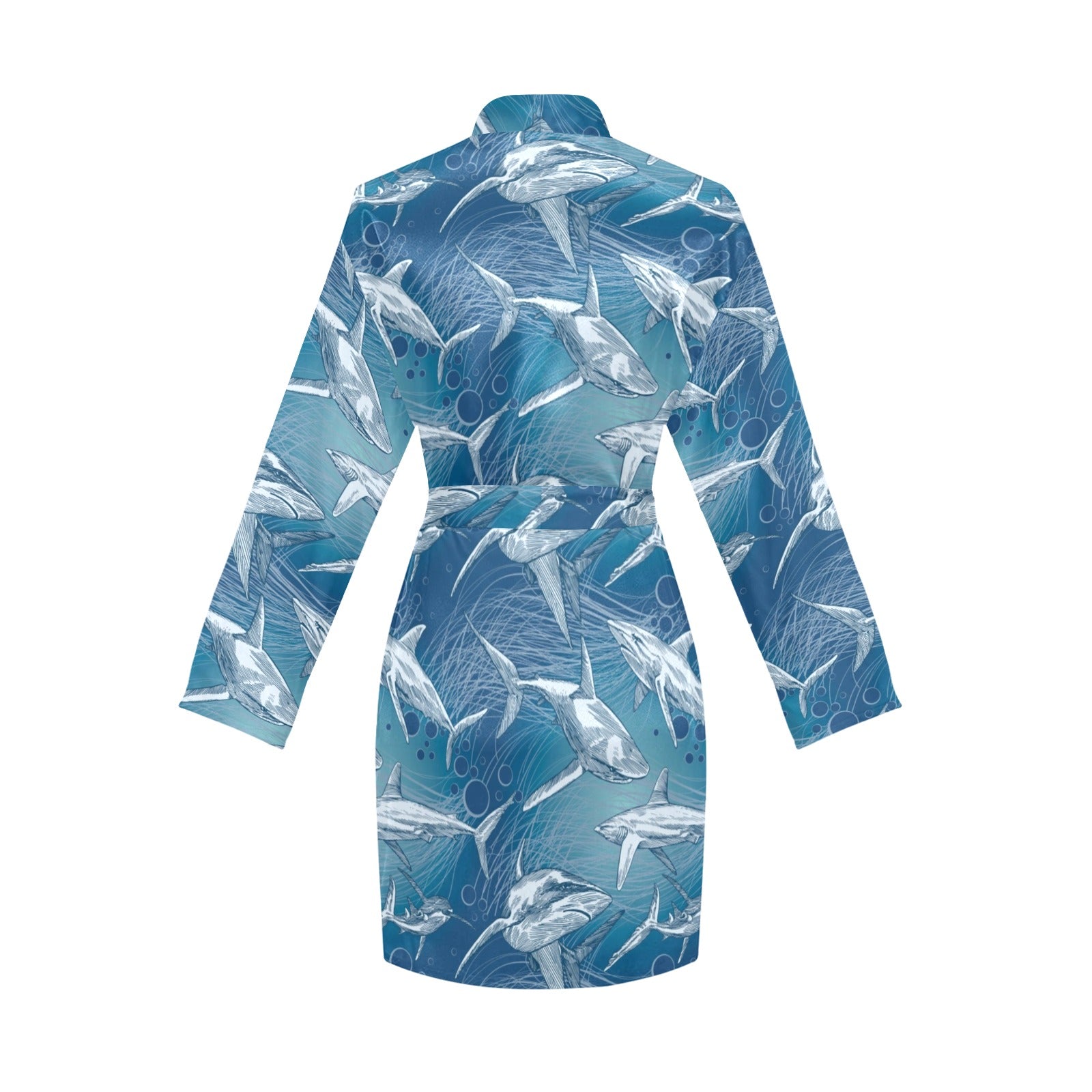 Shark hand drawn Women's Long Sleeve Belted Night Robe