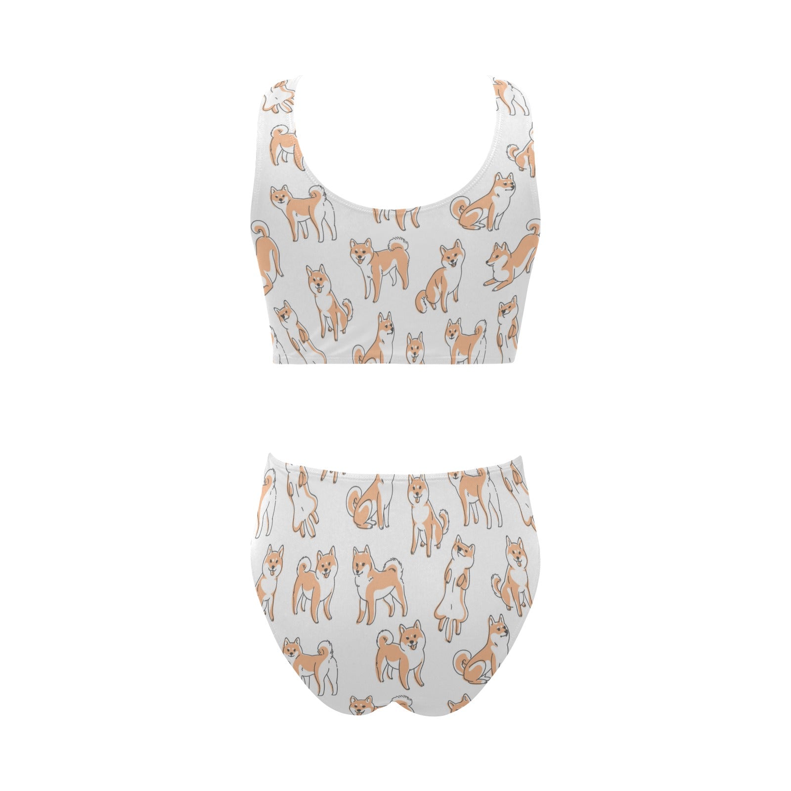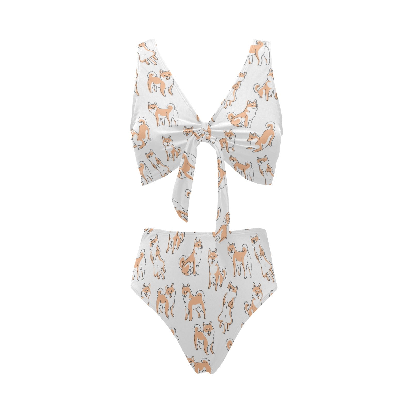 shiba inu dog pattern Chest Bowknot High Waisted Bikini Swimsuit