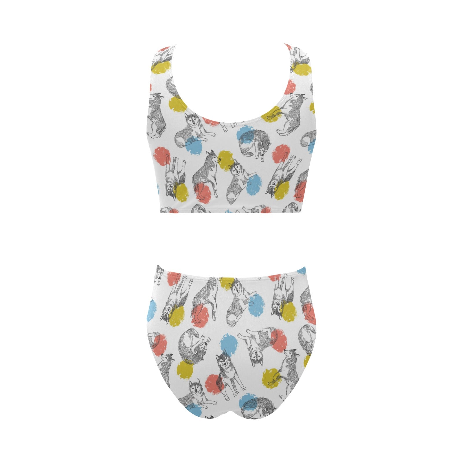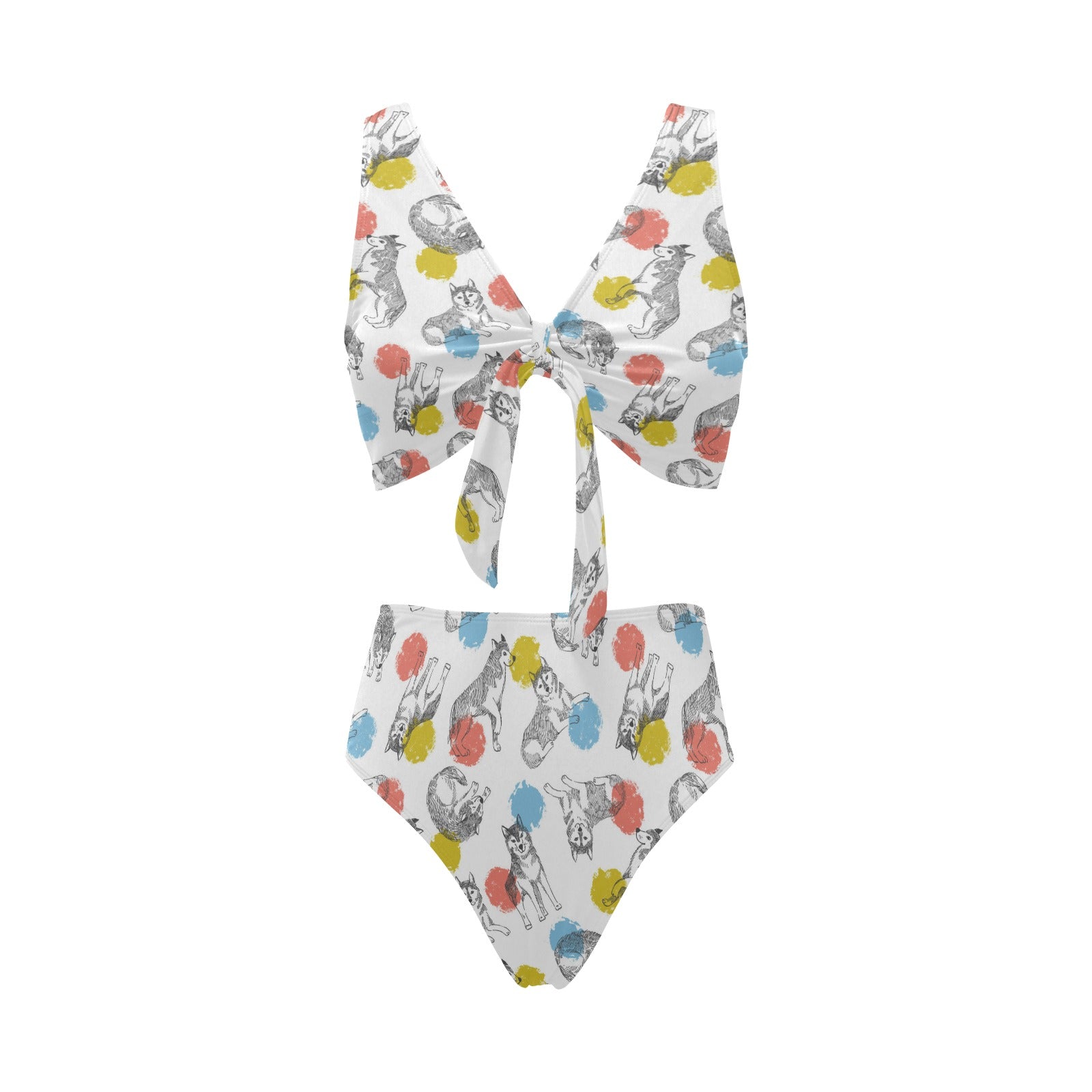 Siberian husky and colorful circle pattern Chest Bowknot High Waisted Bikini Swimsuit