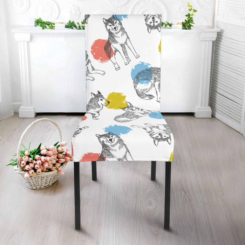 Siberian Husky And Colorful Circle Pattern Dining Chair Slipcover