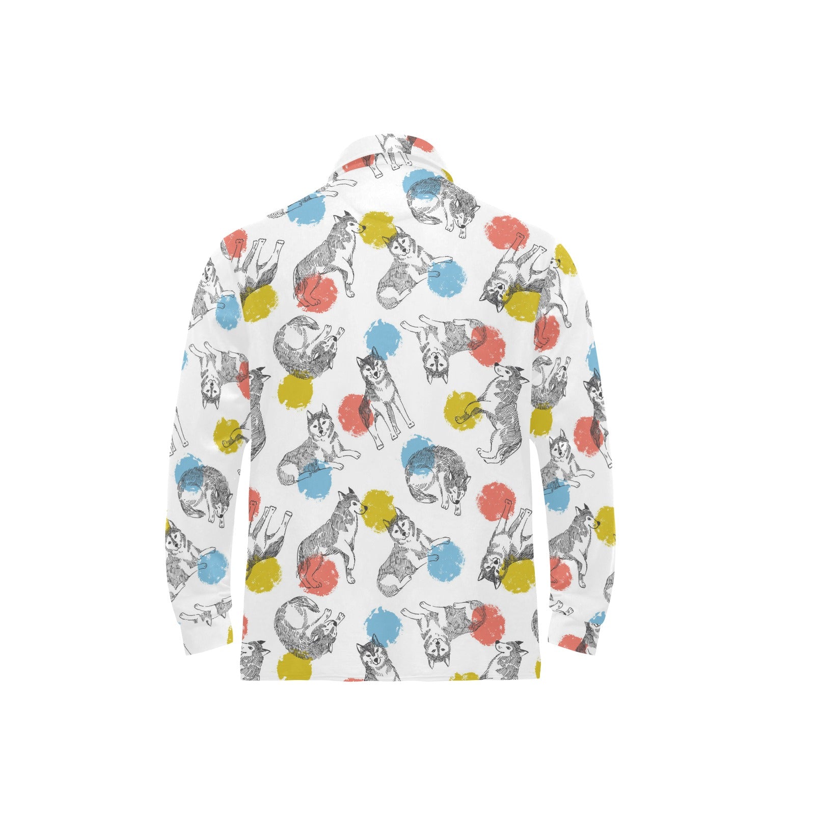 Siberian husky and colorful circle pattern Men's Long Sleeve Polo Shirt