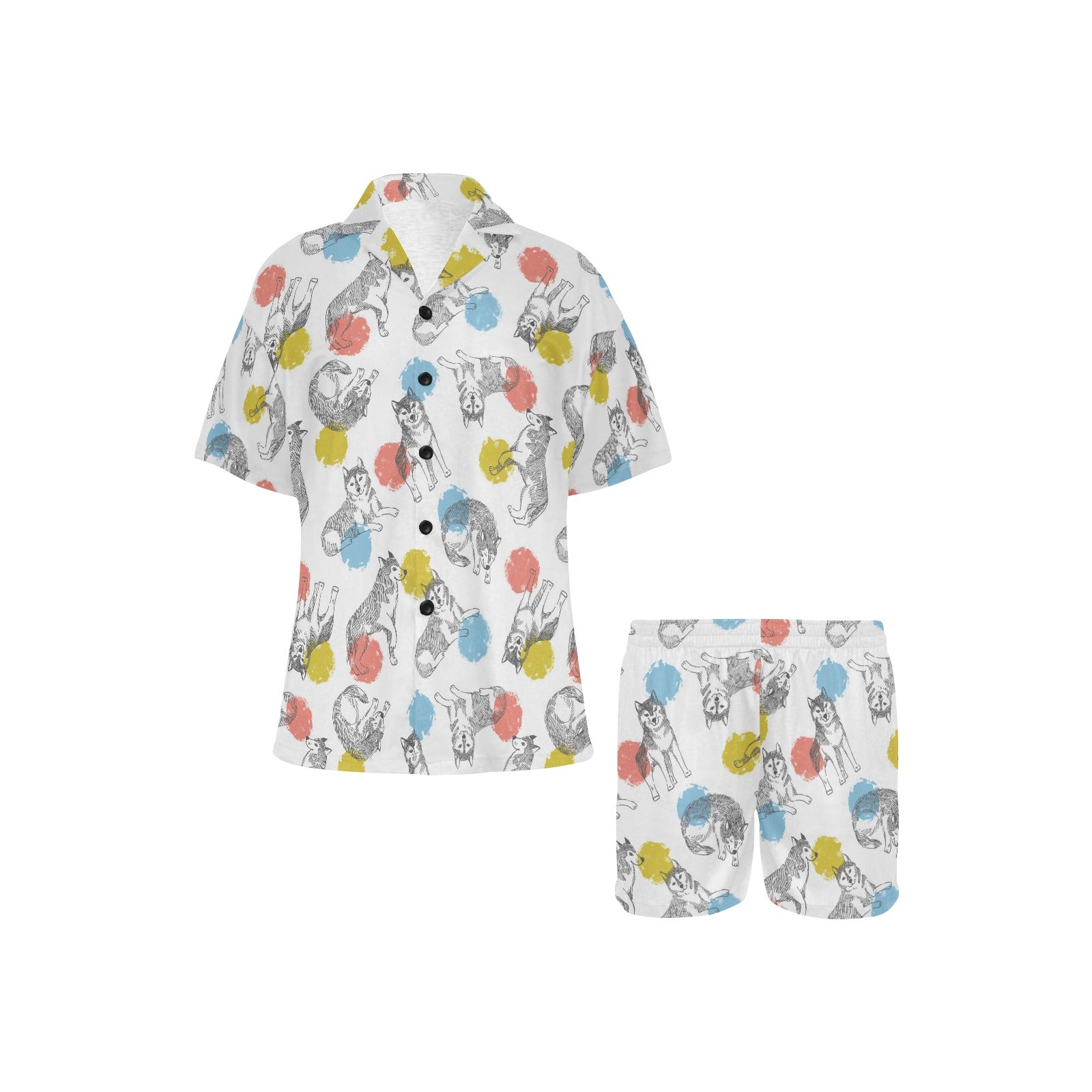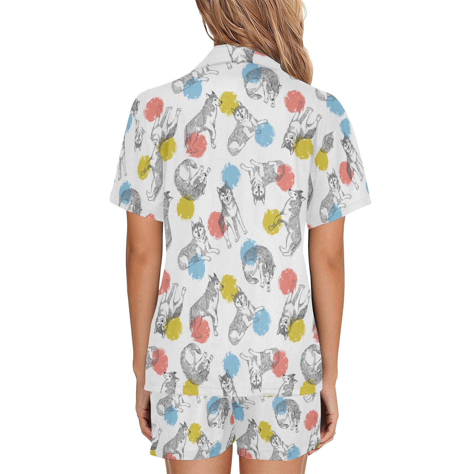 Siberian husky and colorful circle pattern Women's V-Neck Short Pajama Set