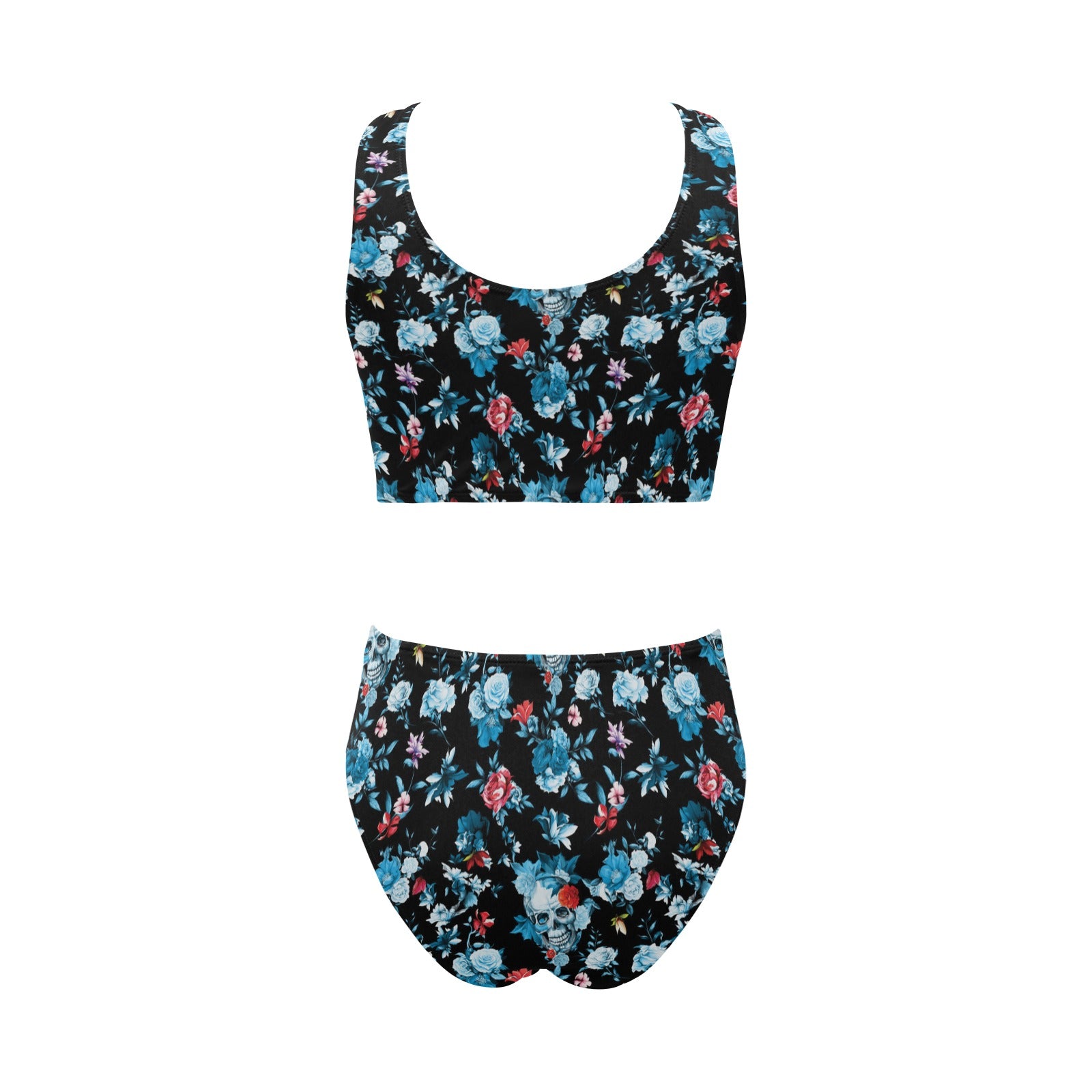 Skull flower roses leave pattern Chest Bowknot High Waisted Bikini Swimsuit