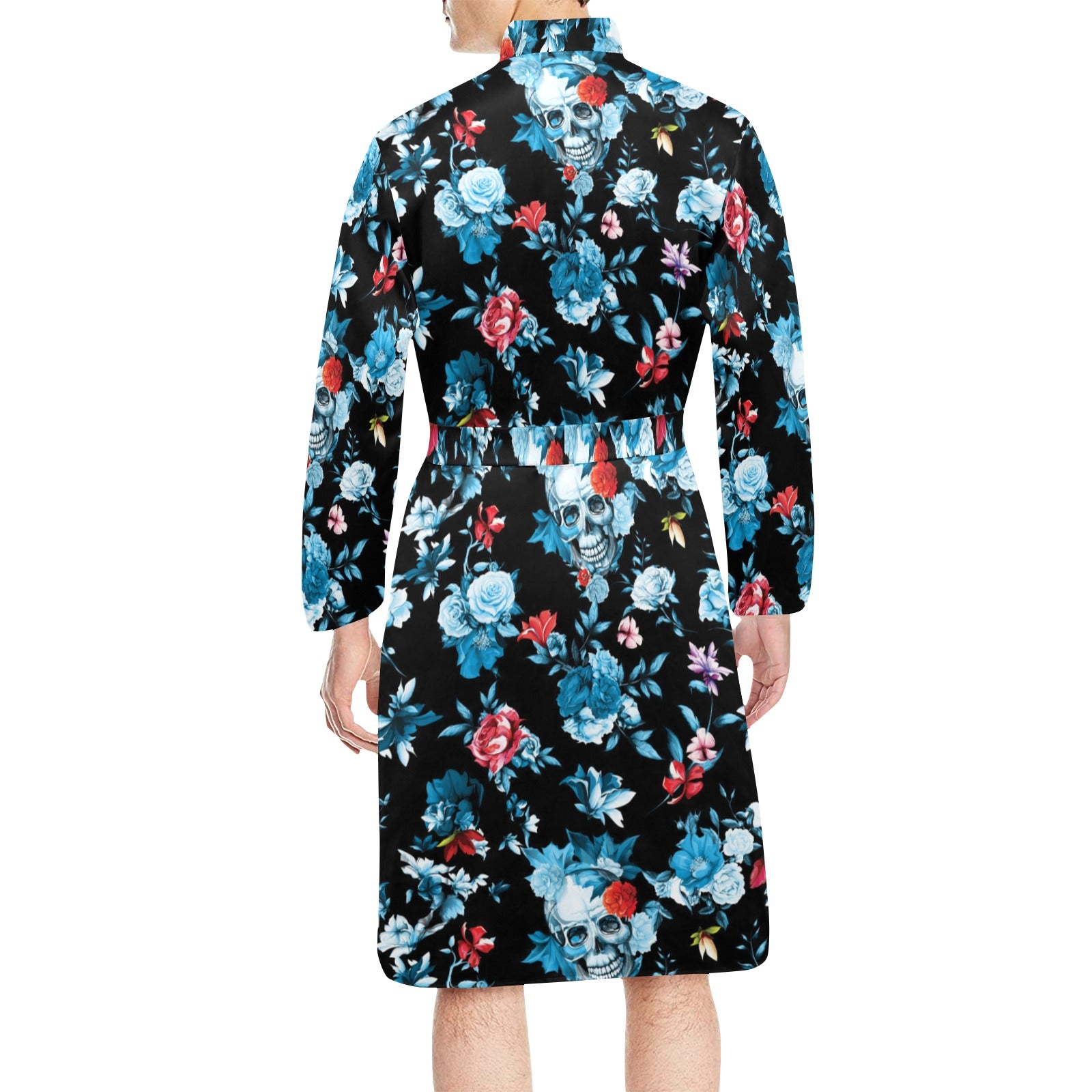 Skull flower roses leave pattern Men's Long Sleeve Belted Night Robe
