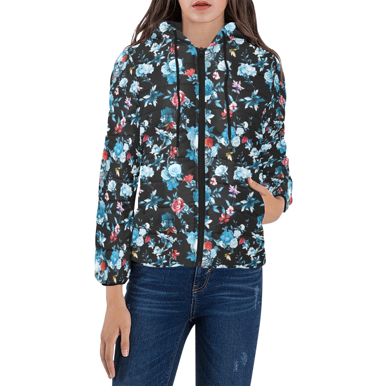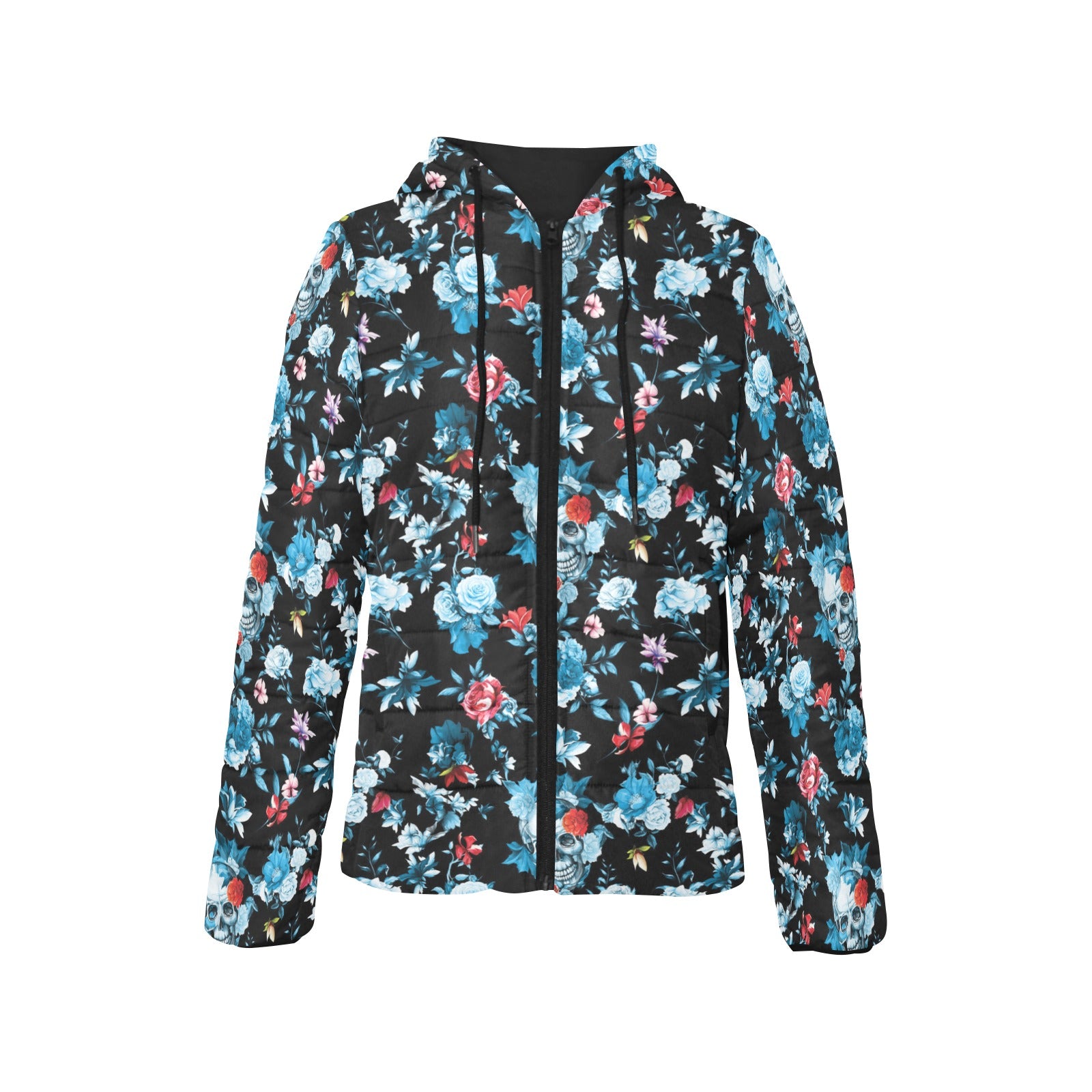 Skull flower roses leave pattern Women's Padded Hooded Jacket